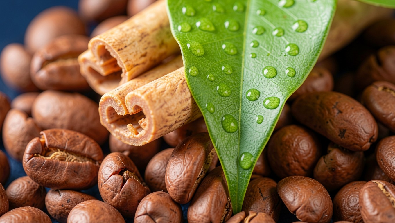 Зерна кофе палочки корицы зеленый лист