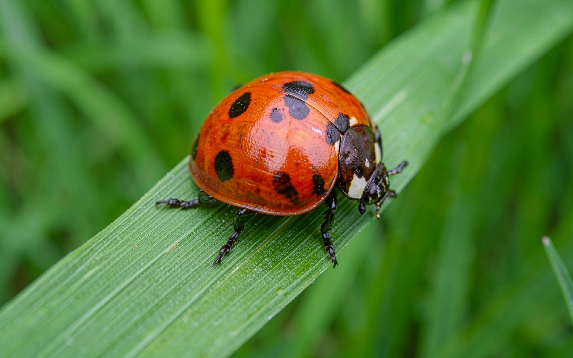 Божья коровка с черными пятнами на зеленом листе