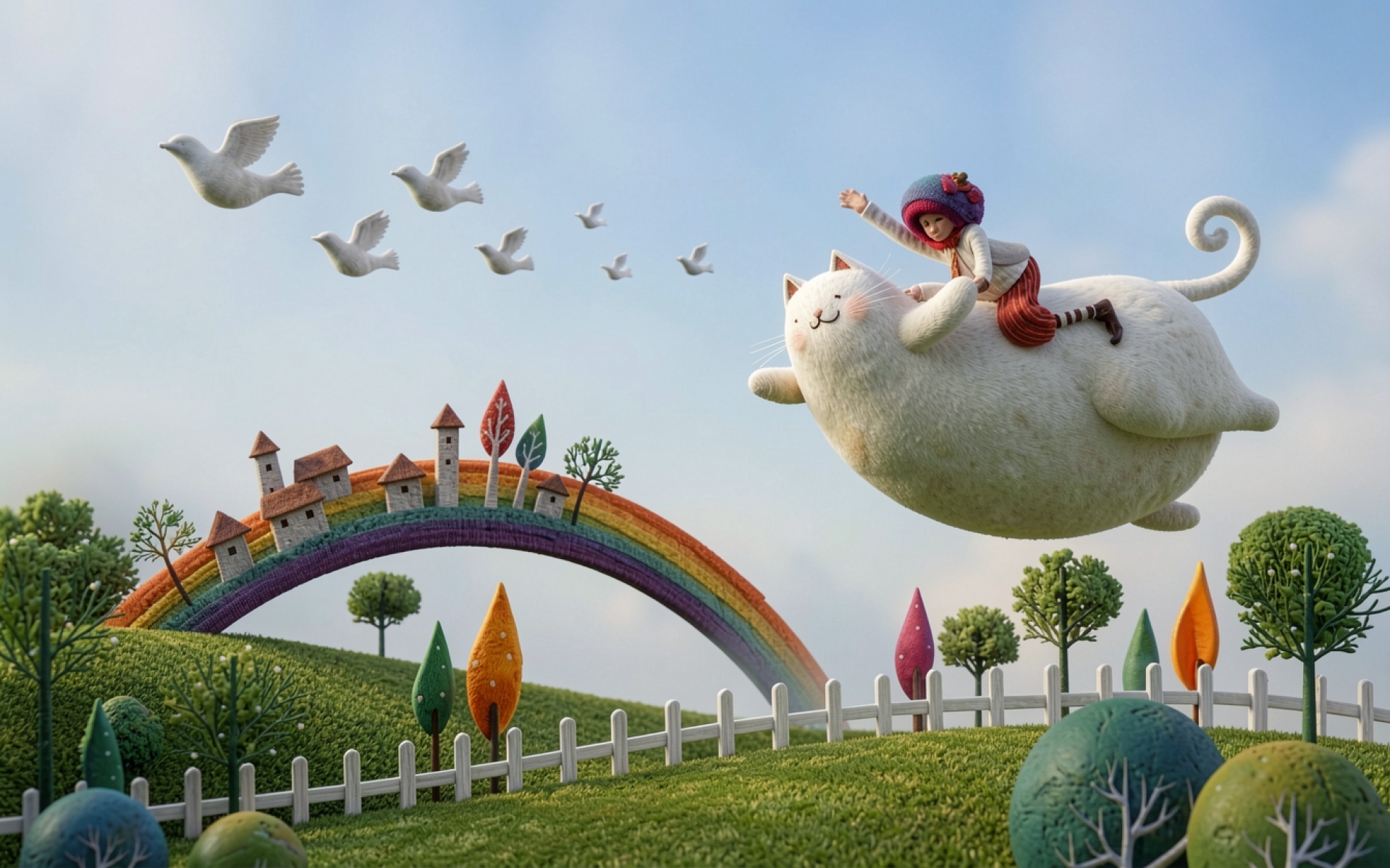 Девочка на белом коте над радугой