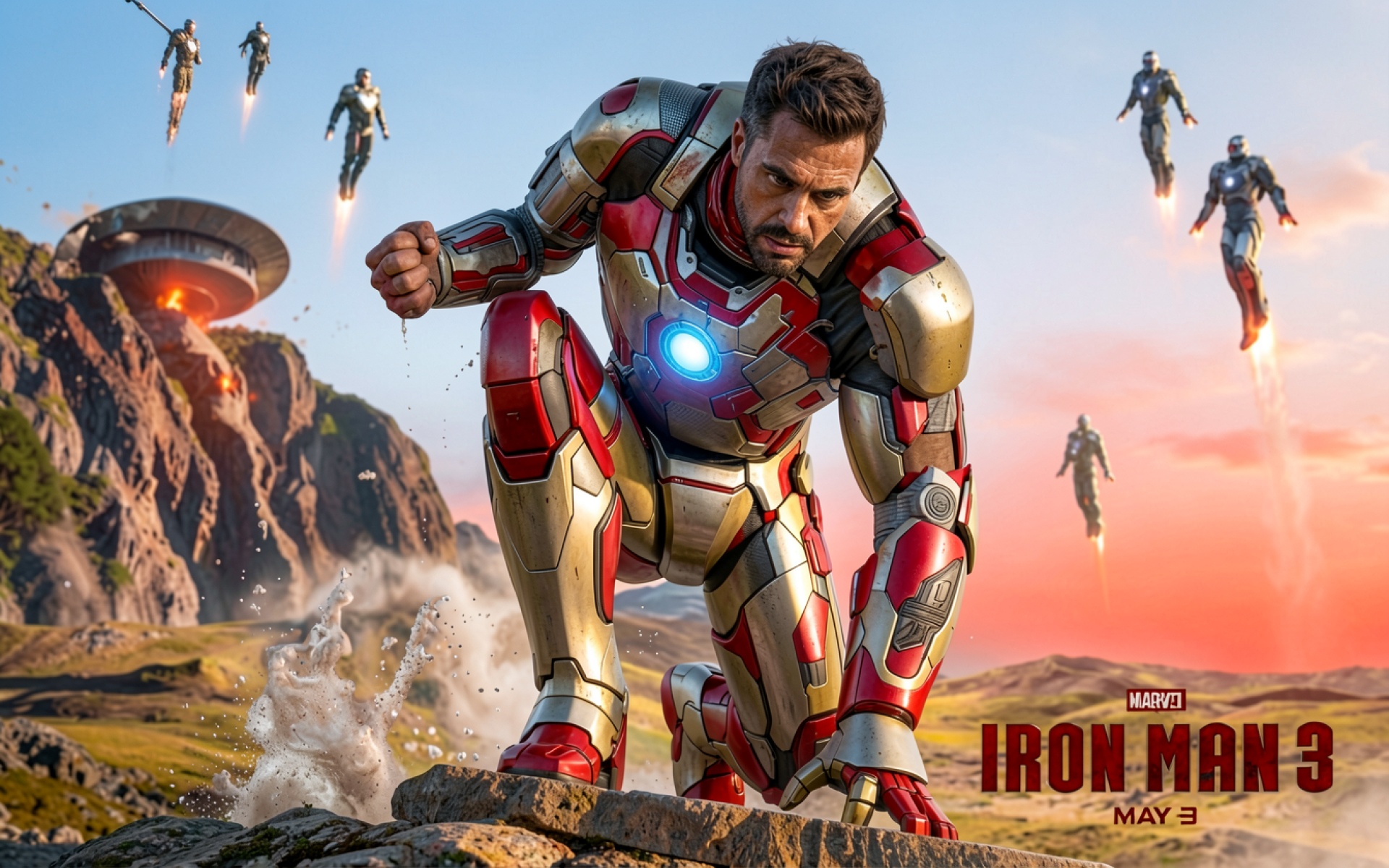 Железный человек в красно-золотой броне на скалах