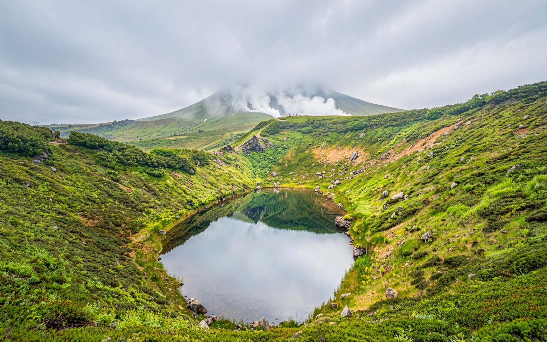 Горное озеро в зеленом кратере под облаками