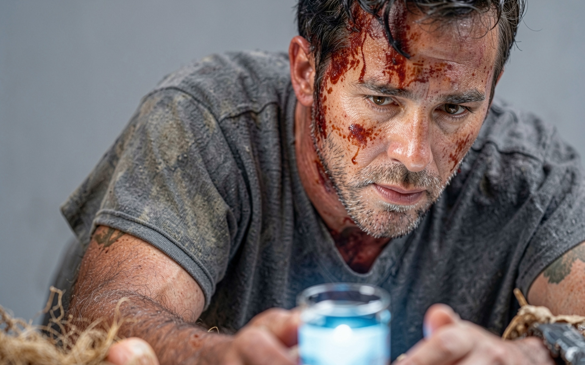 Мужчина с кровью на лице в темной комнате