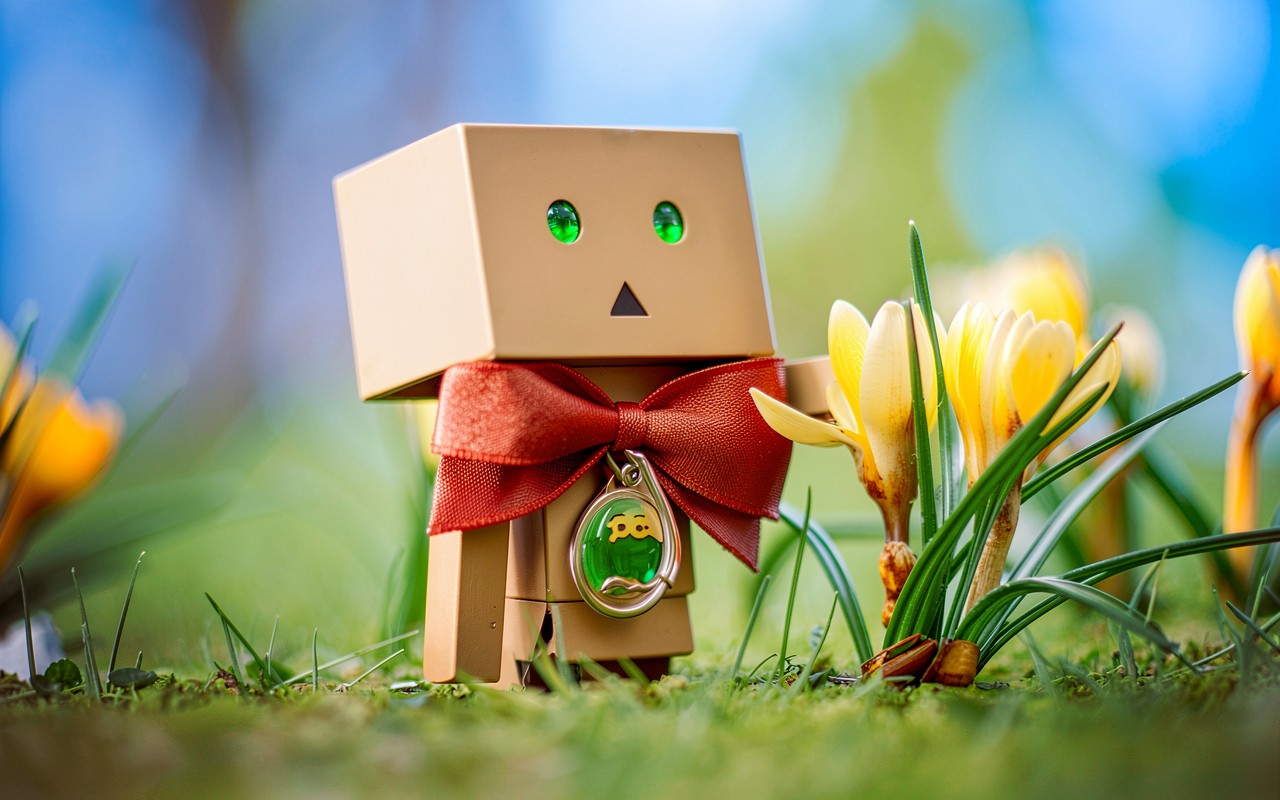 Робот Danbo с красным бантом среди крокусов