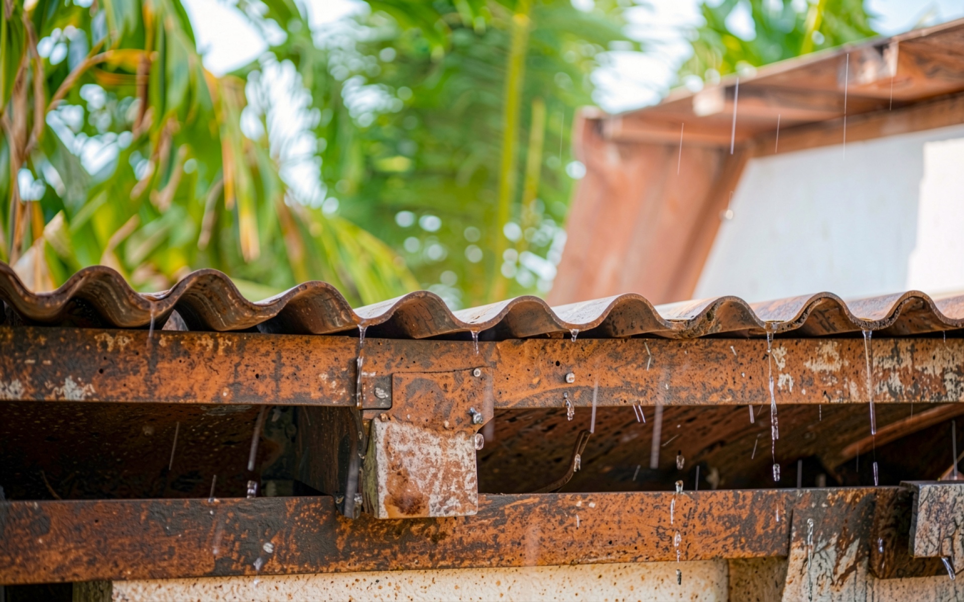 Ржавая металлическая крыша под тропическим дождем