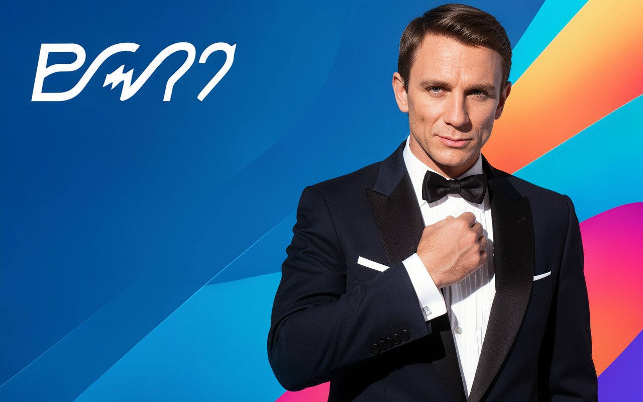 Портрет Дэниела Крэйга в черном смокинге на синем фоне