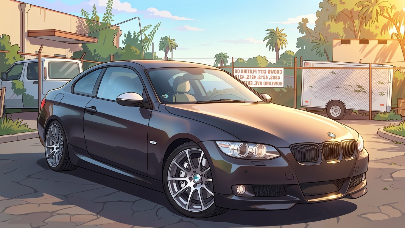 Черный BMW купе в солнечном городе