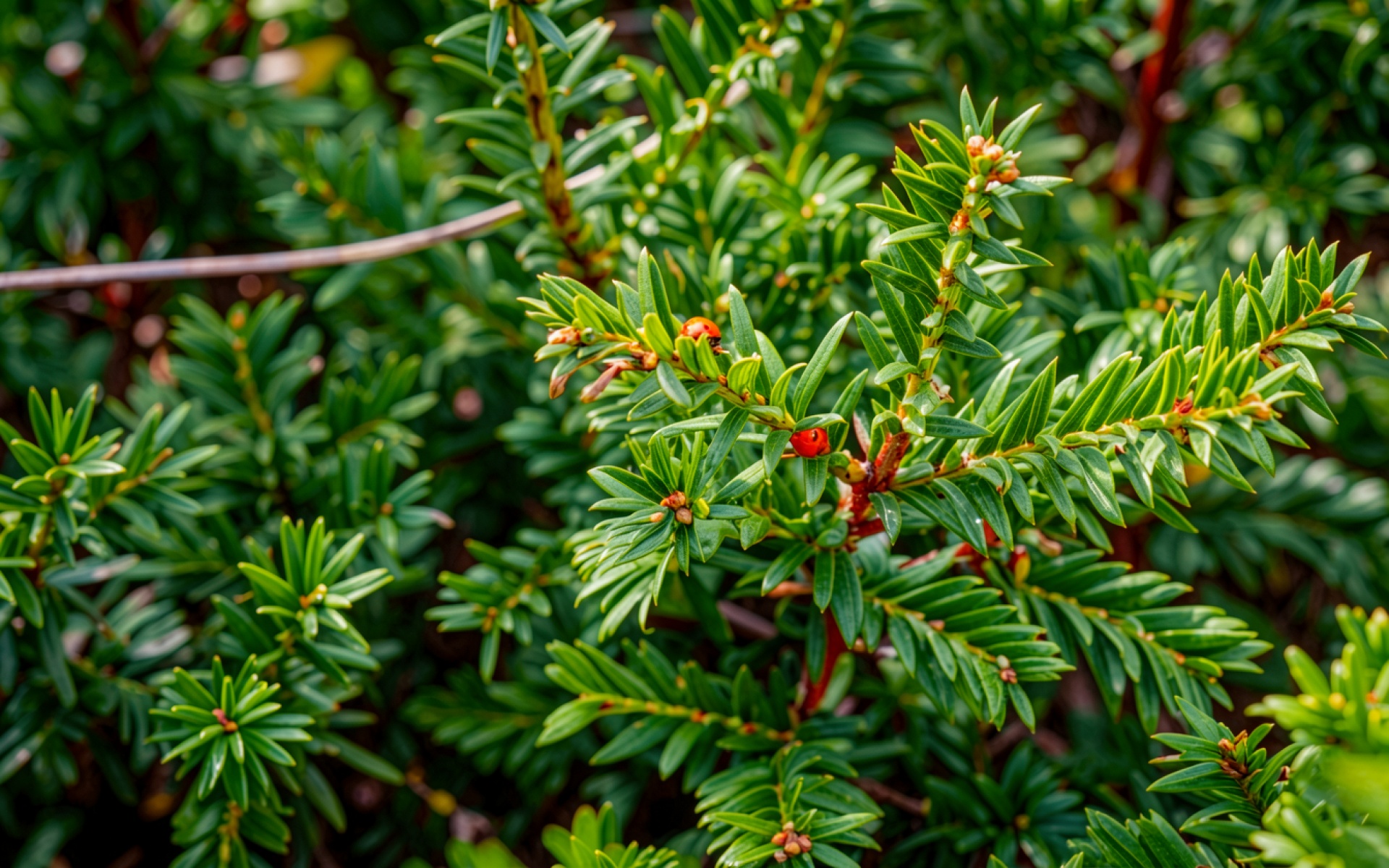 Зеленый куст тиса с красными ягодами