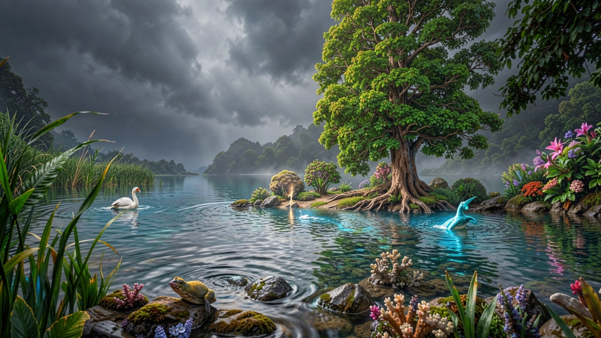 Фантастический пейзаж с деревом и лебедем