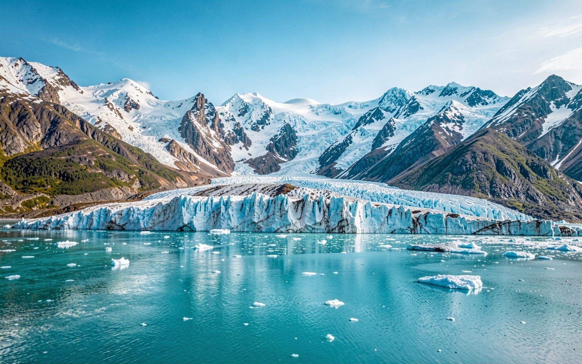 Голубой ледник в окружении заснеженных гор
