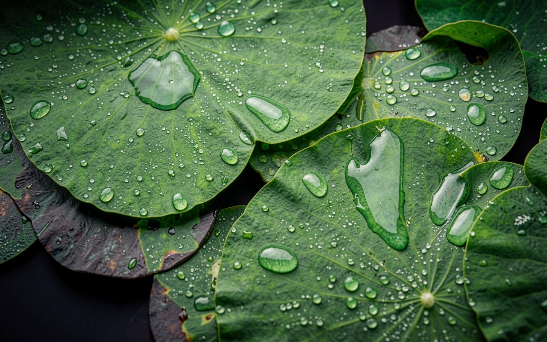 Зеленые листья лотоса с каплями росы