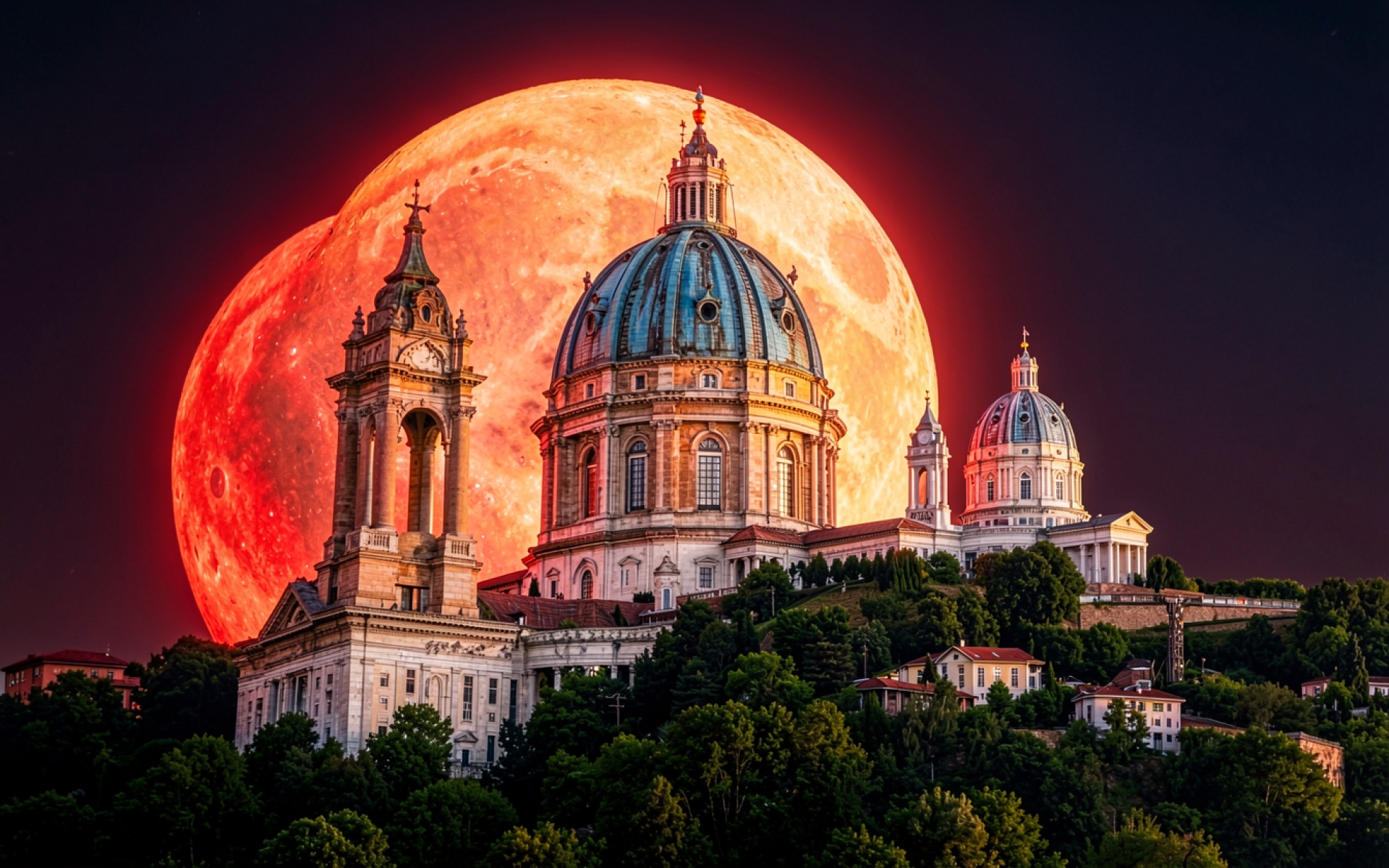 Собор с красной луной в ночном городе