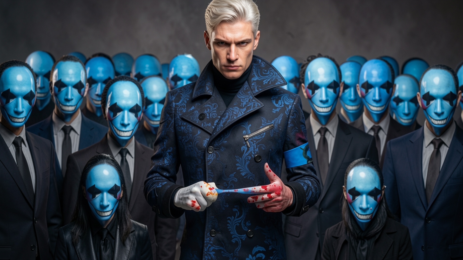 Мужчина в синем пальто среди людей в масках