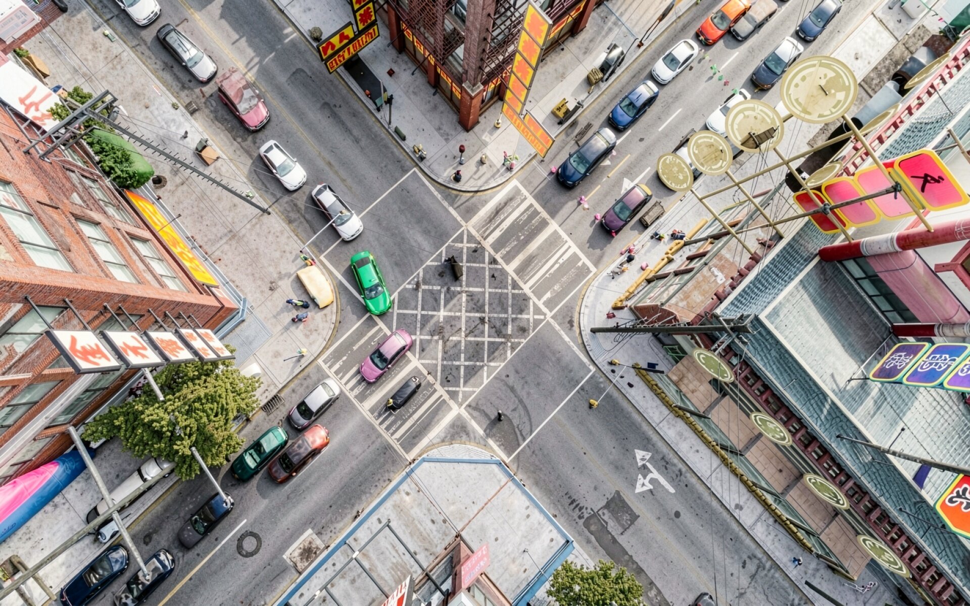 Вид сверху на перекресток Чайна-тауна с машинами