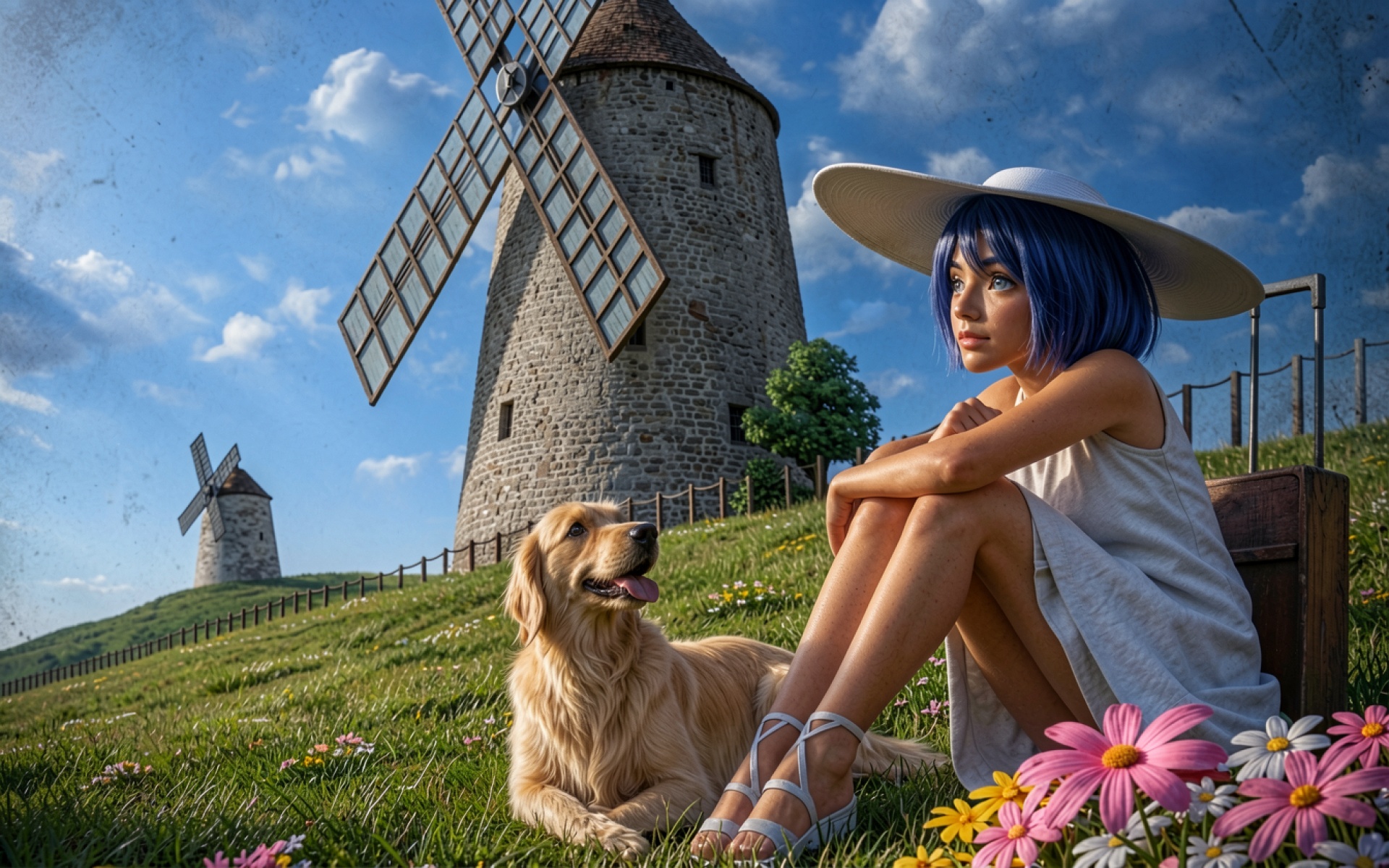 Девушка с синими волосами и золотистый ретривер у мельницы