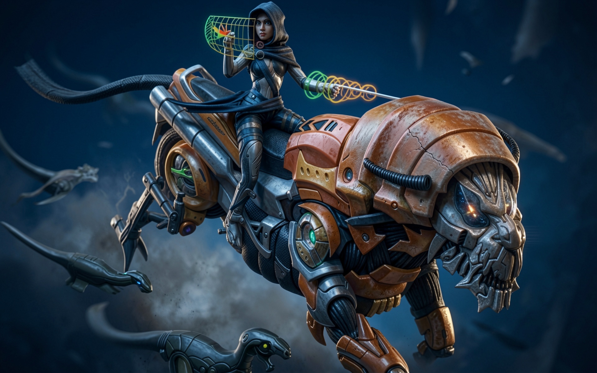 Девушка в капюшоне на механическом тигре киберпанк