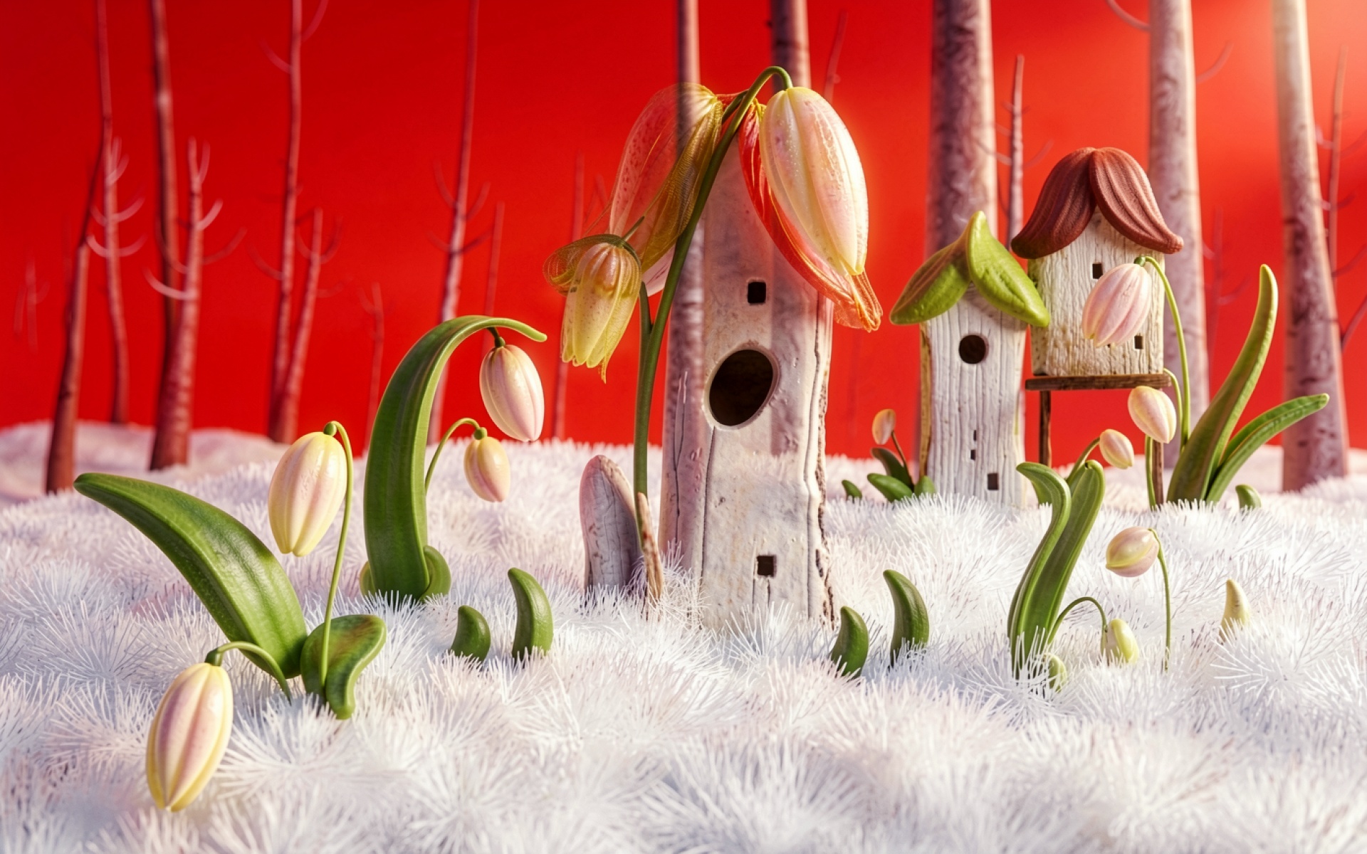 Миниатюрные домики в белом лесу с тюльпанами
