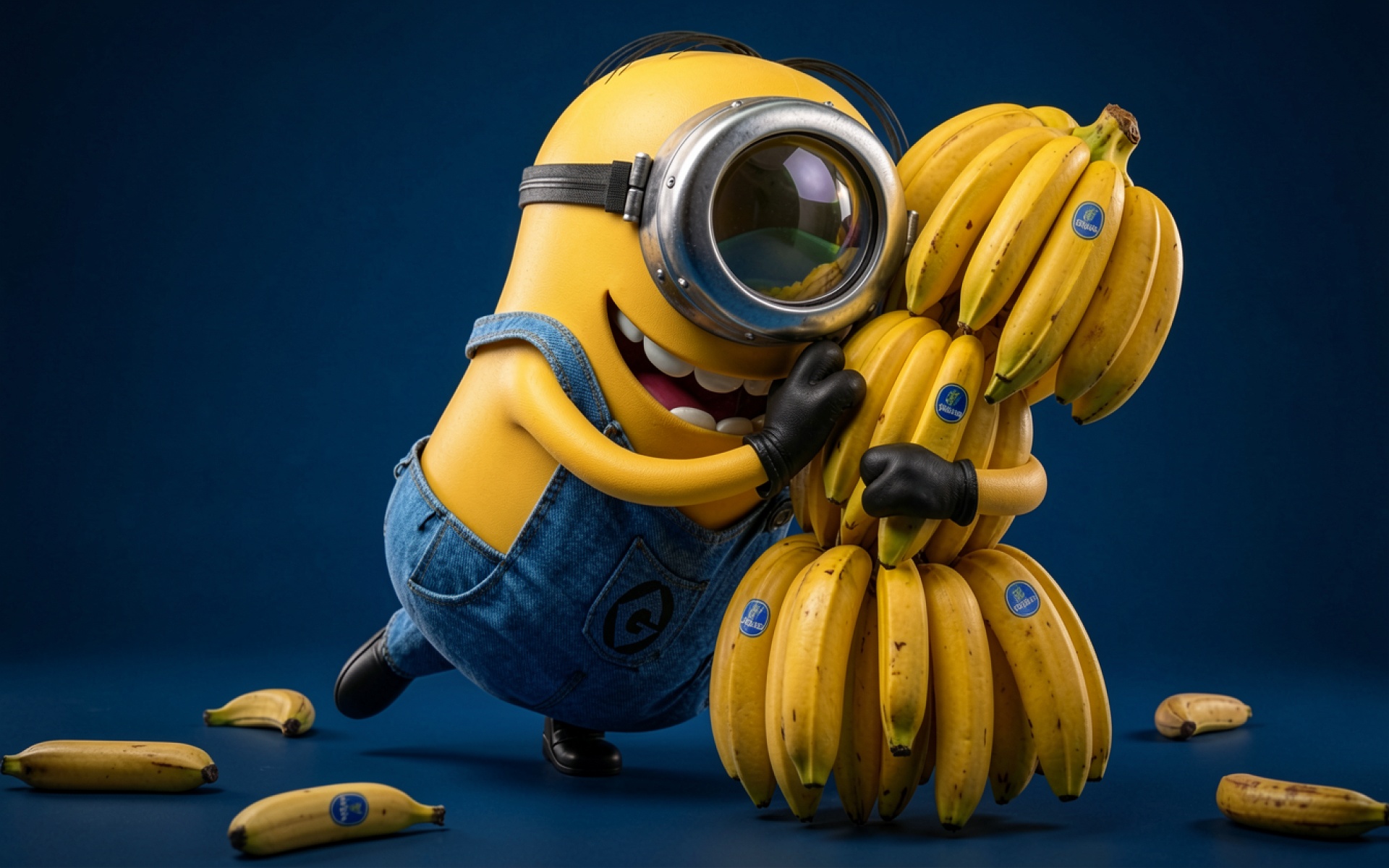 Миньон с бананами на темно-синем фоне