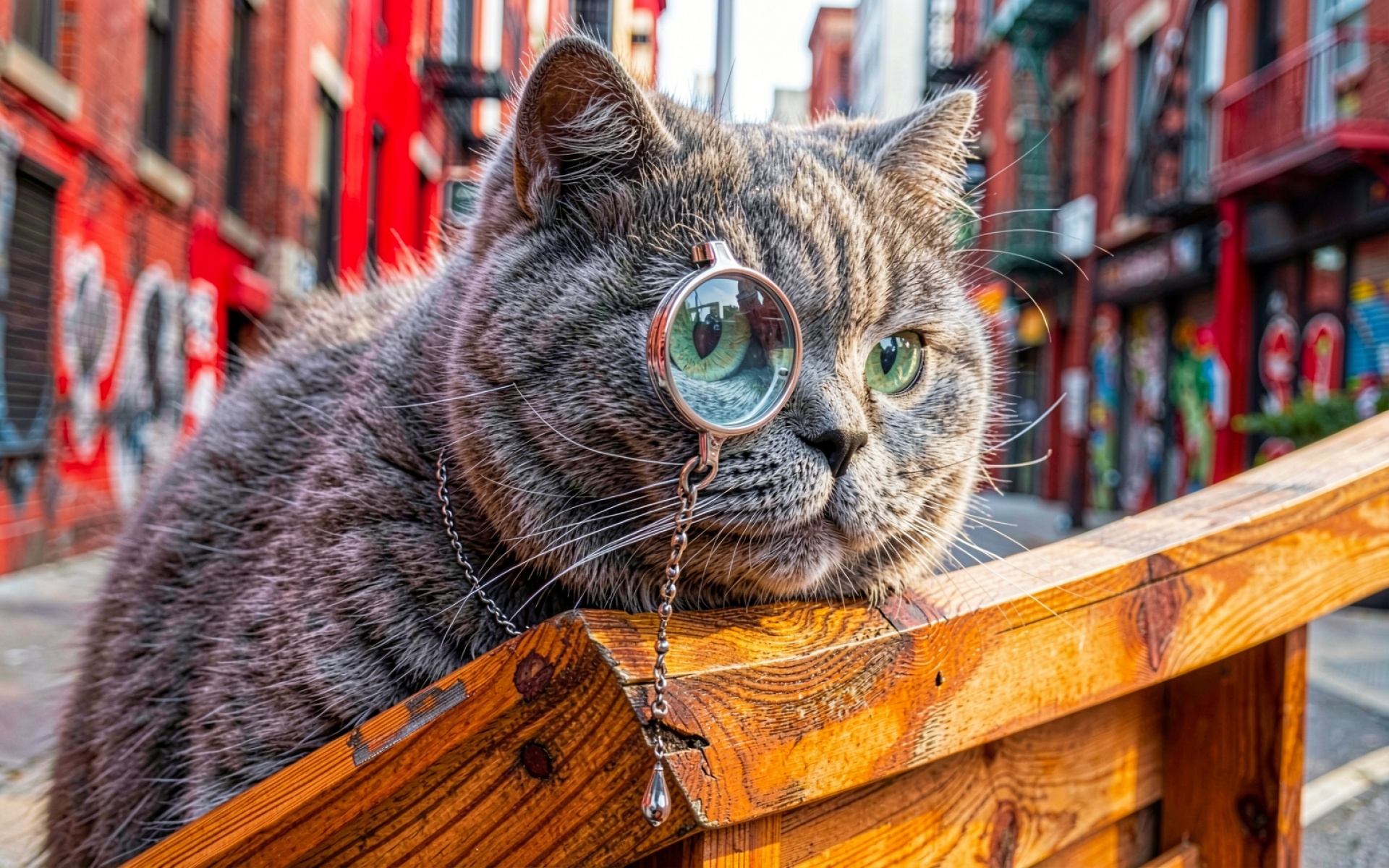 Серый полосатый кот в монокле на фоне города