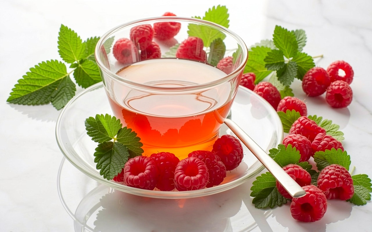 Стакан малинового чая с ягодами на мраморе