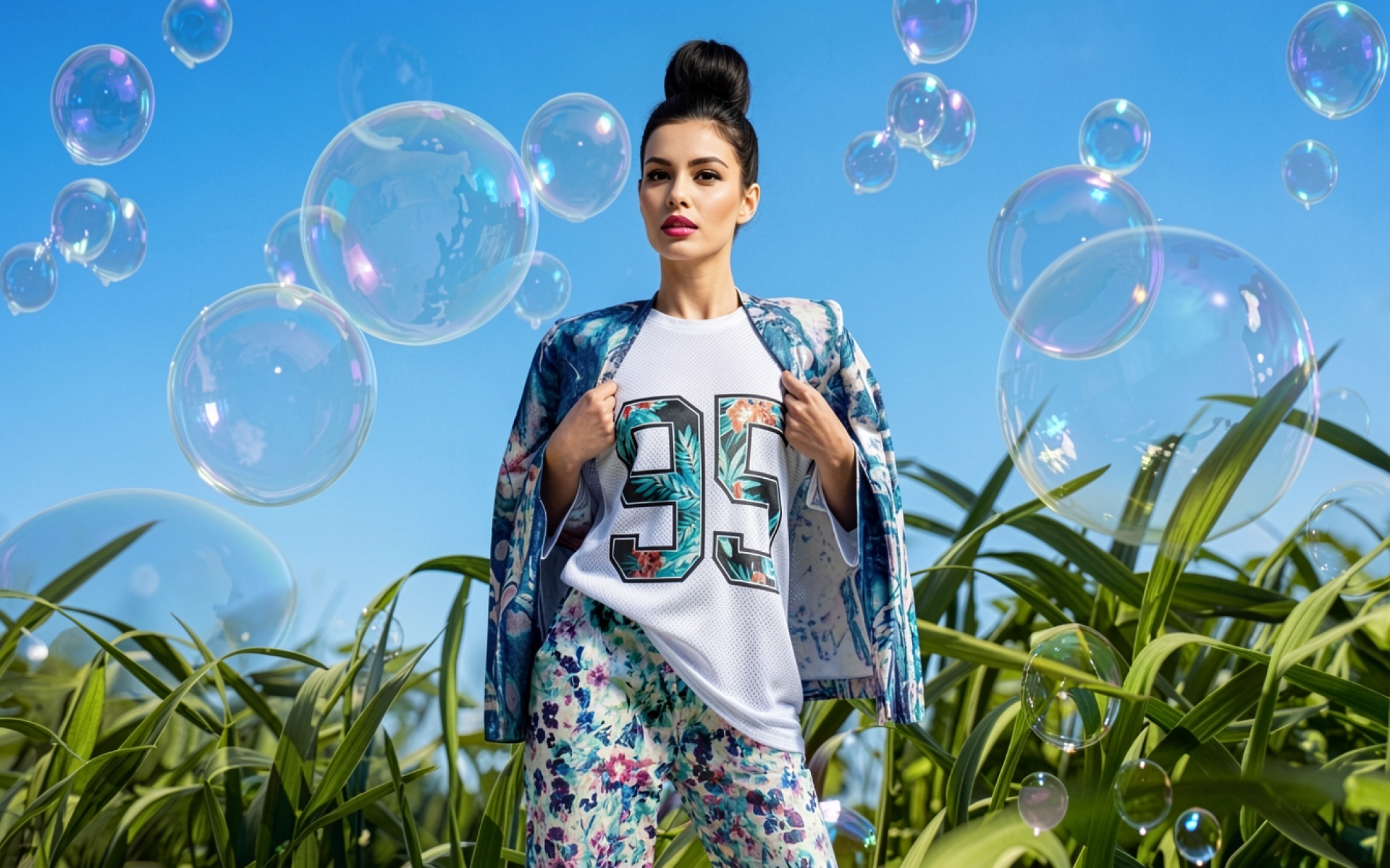 Девушка в тропической одежде среди мыльных пузырей