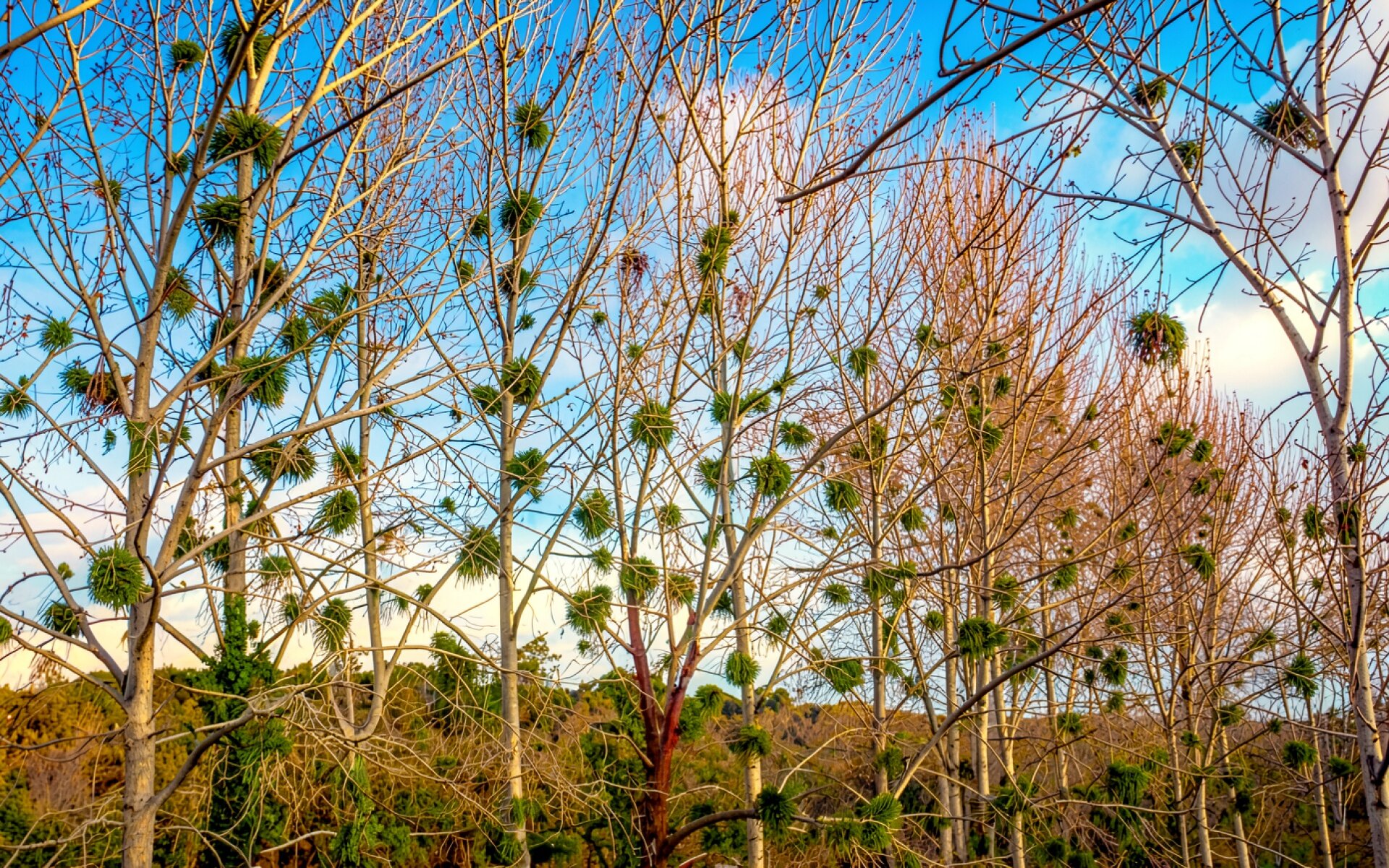 Зимние белые деревья с зелеными наростами