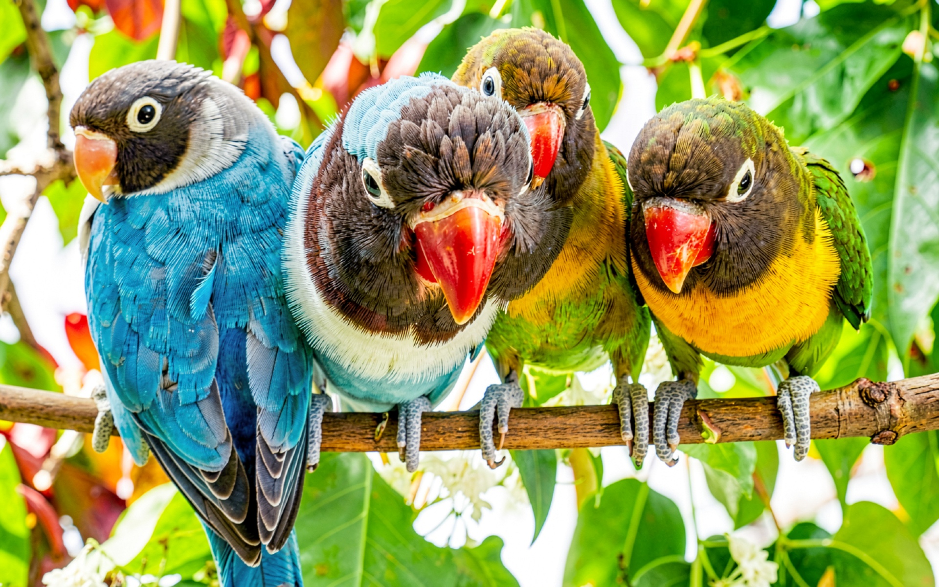 Четыре разноцветных неразлучника на коричневой ветке дерева