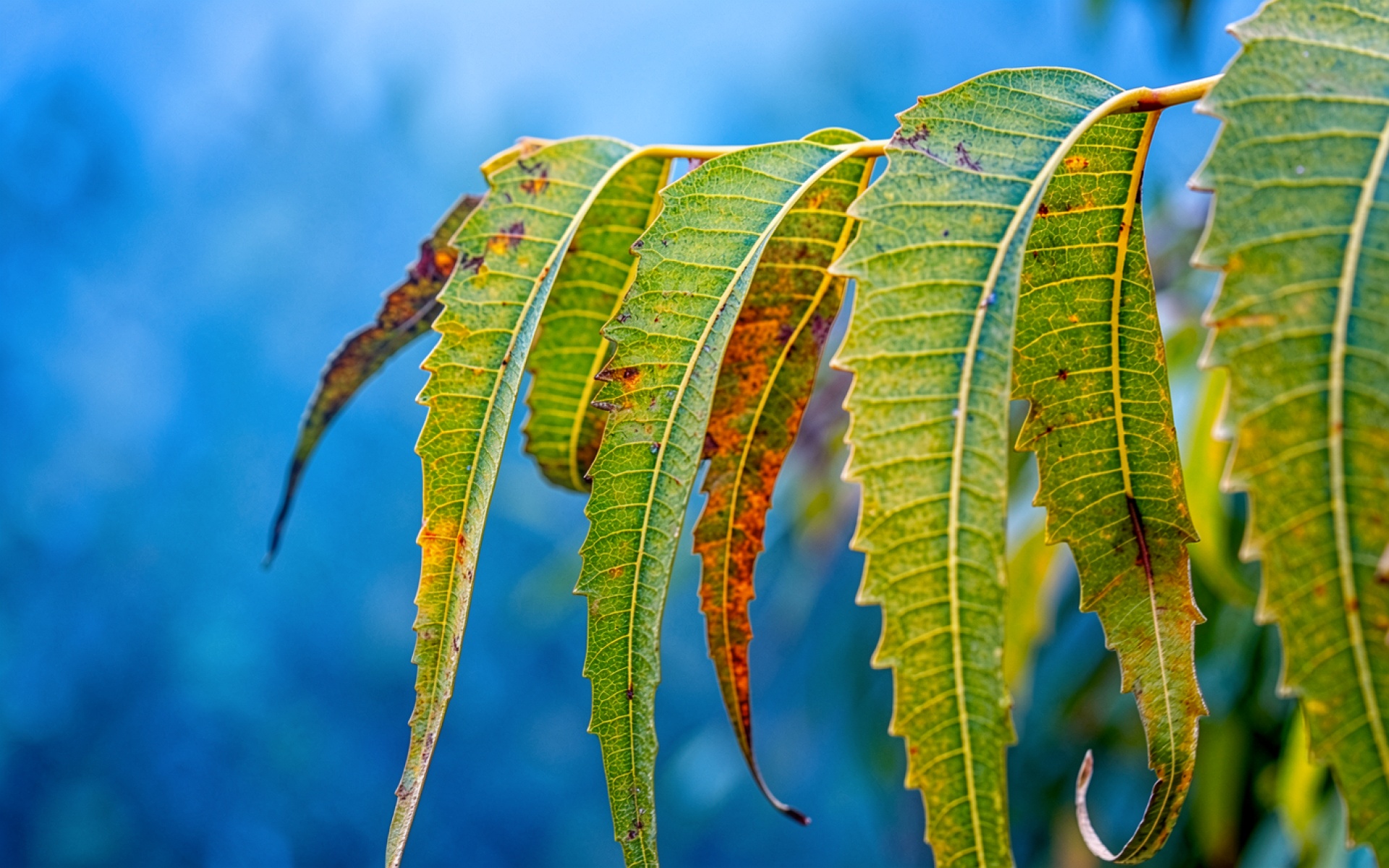 Зеленые листья дерева ним на синем фоне