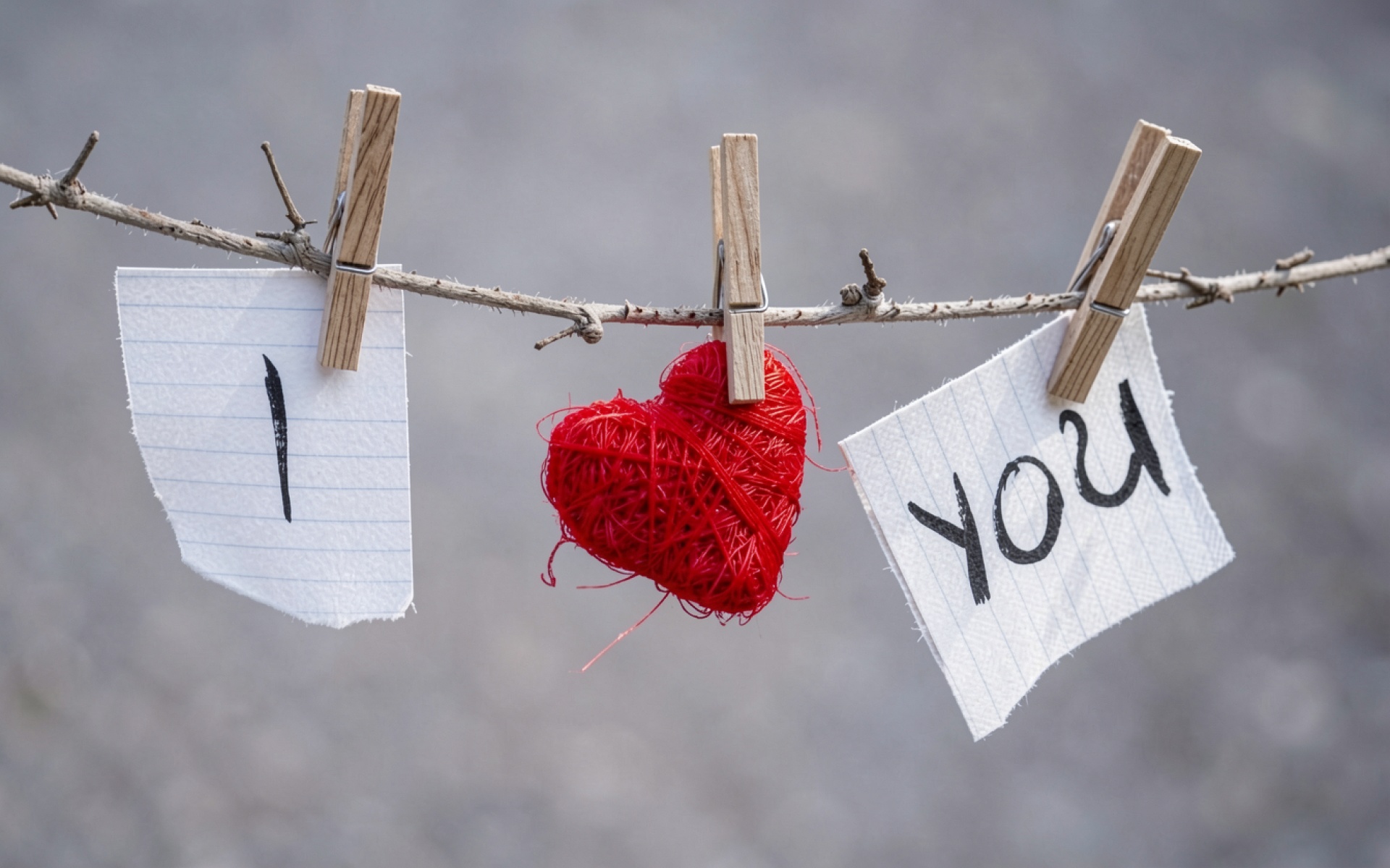 Красное сердце из ниток на ветке