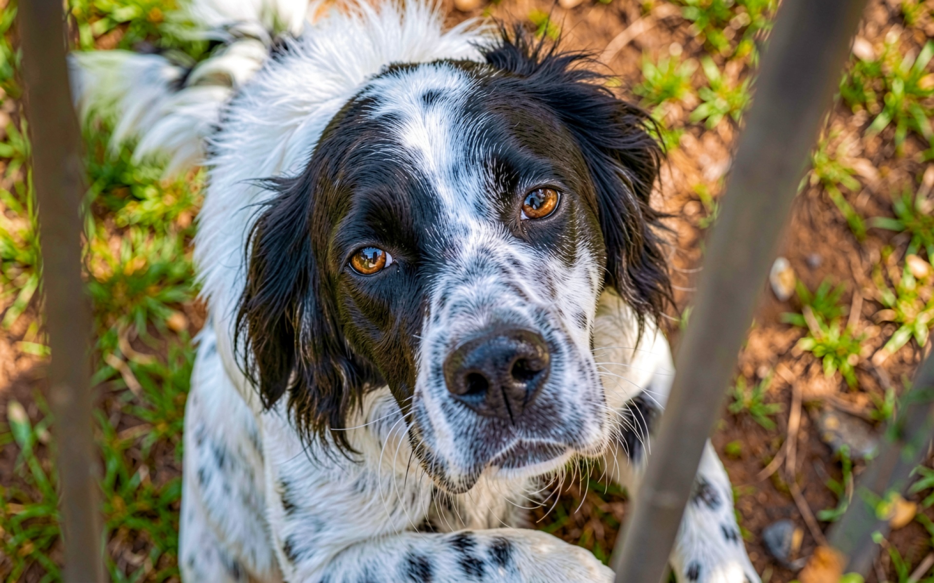 Черно белый спаниель за железной оградой