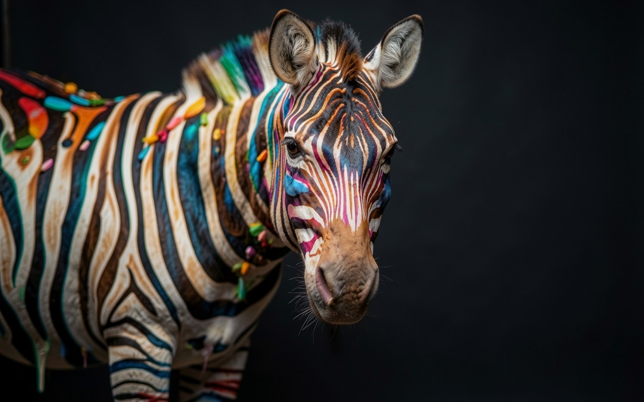 Разноцветная зебра на темном однотонном фоне