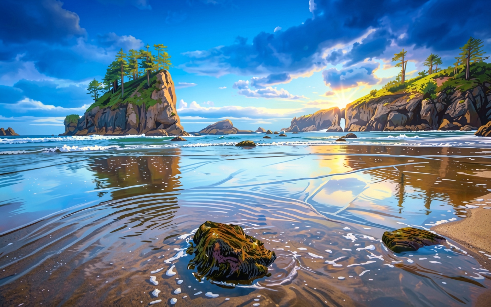 Пейзаж океанского побережья с камнями при закате