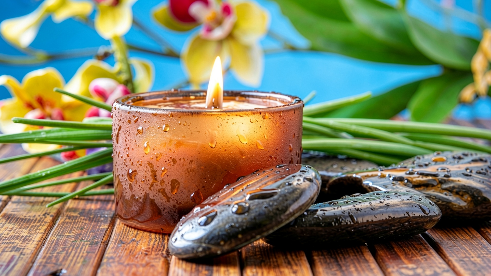 Зажженная ароматическая свеча с камнями и орхидеями