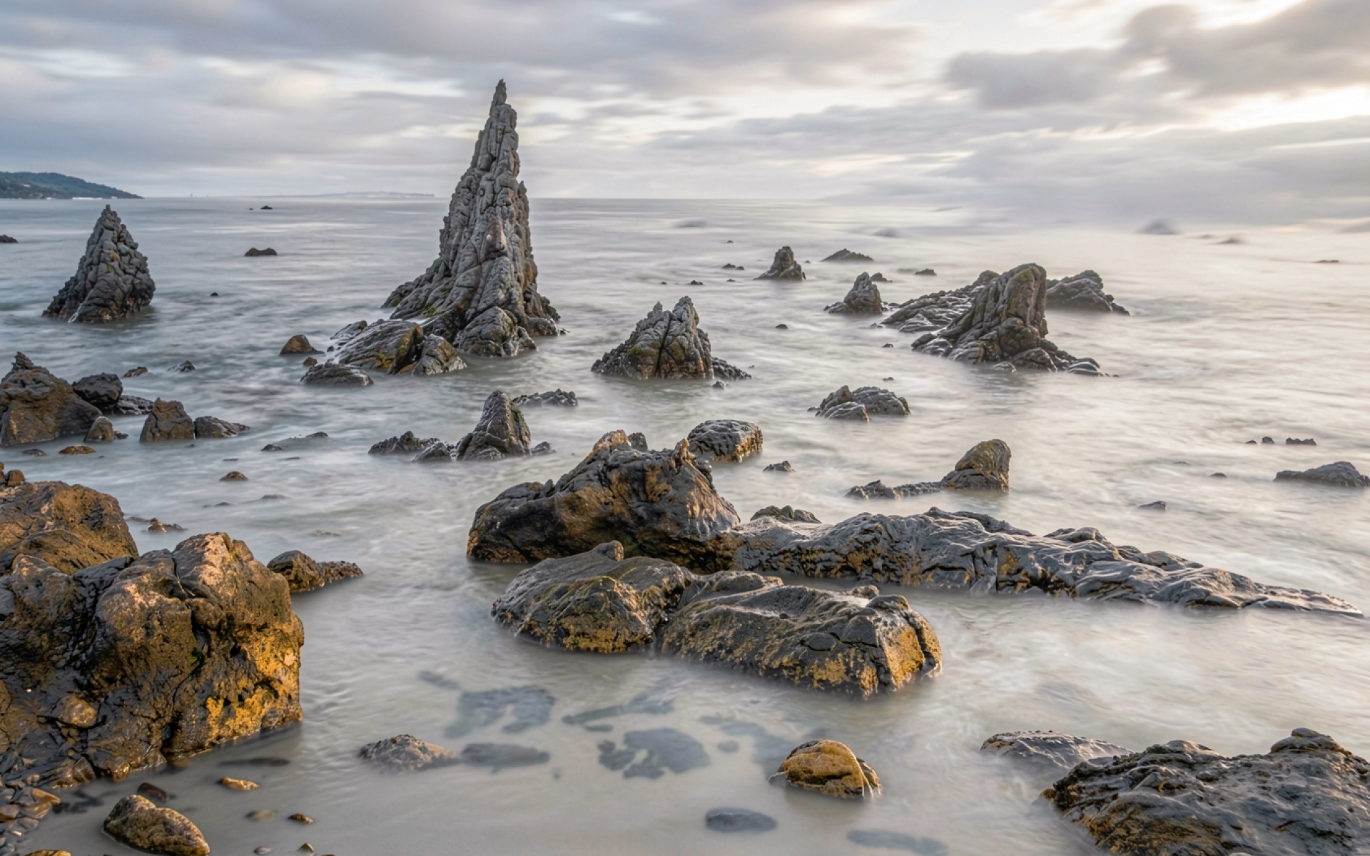 Острые скалы в океане при закатном небе