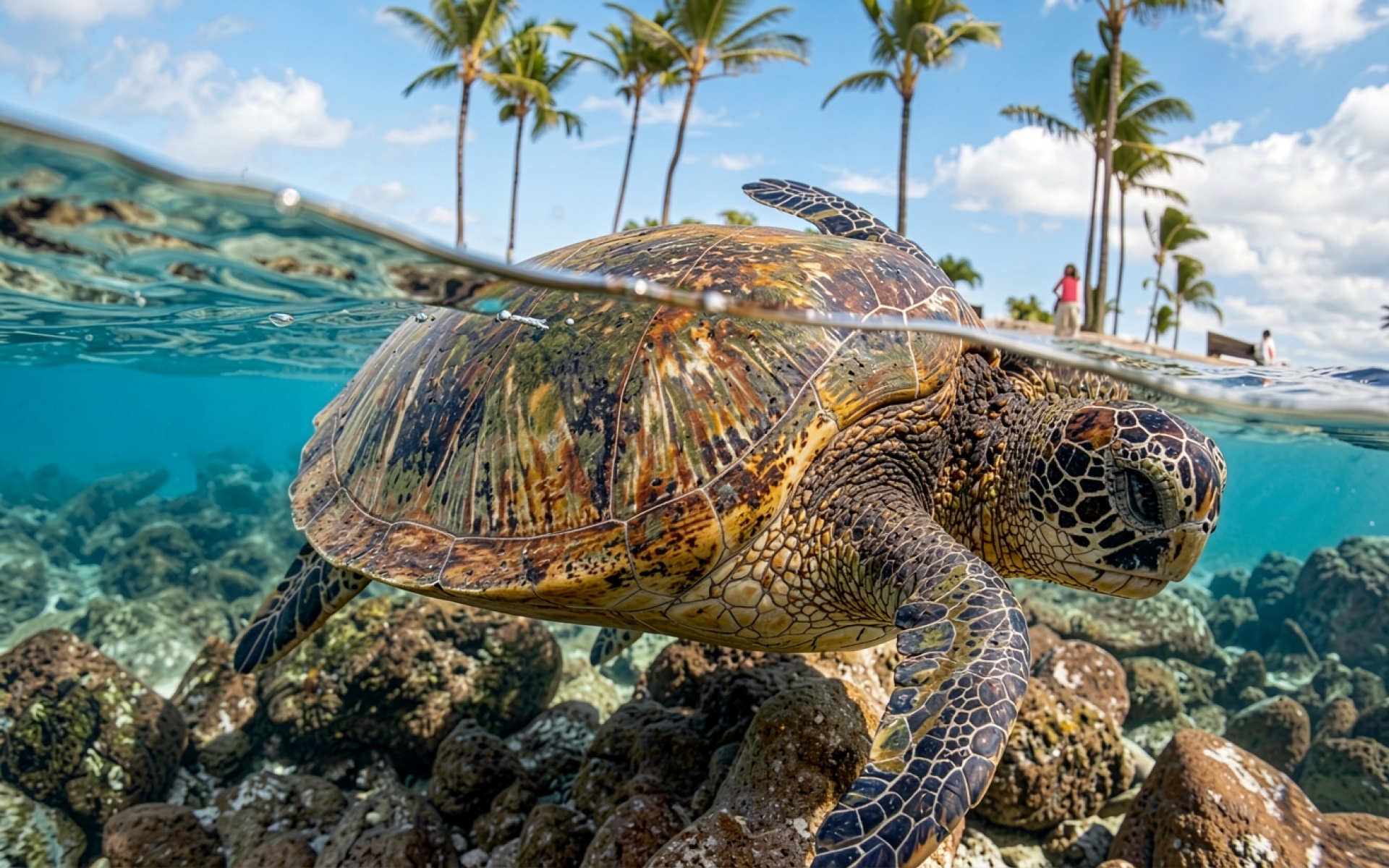Морская черепаха в тропической воде с пальмами