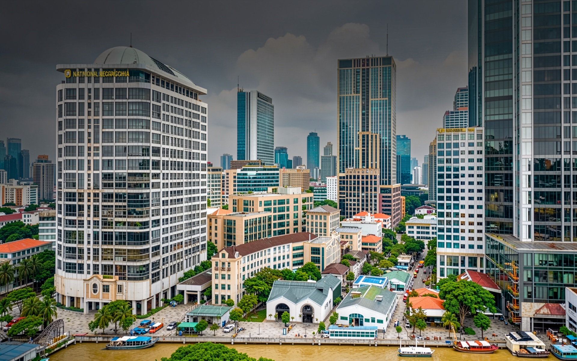 Городской пейзаж Сингапура серые небоскребы пасмурно