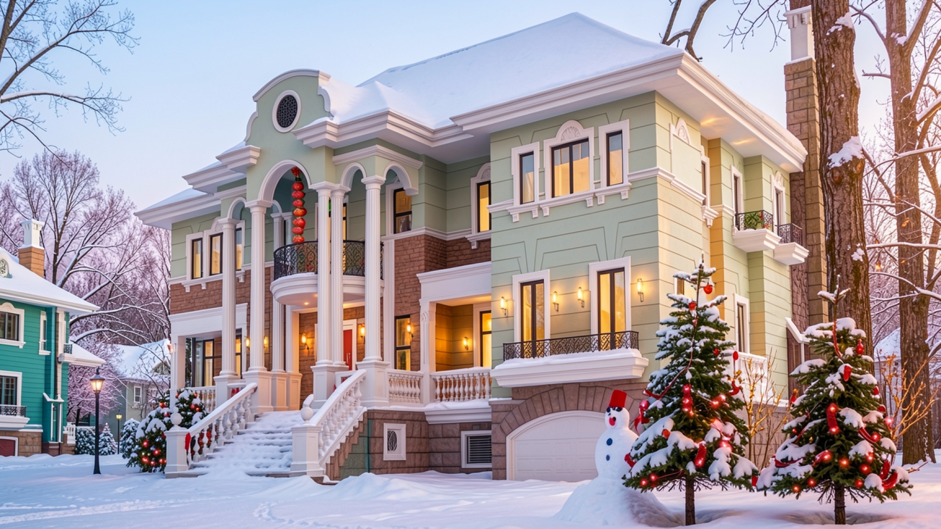 Зимний особняк пастельного цвета в снегу