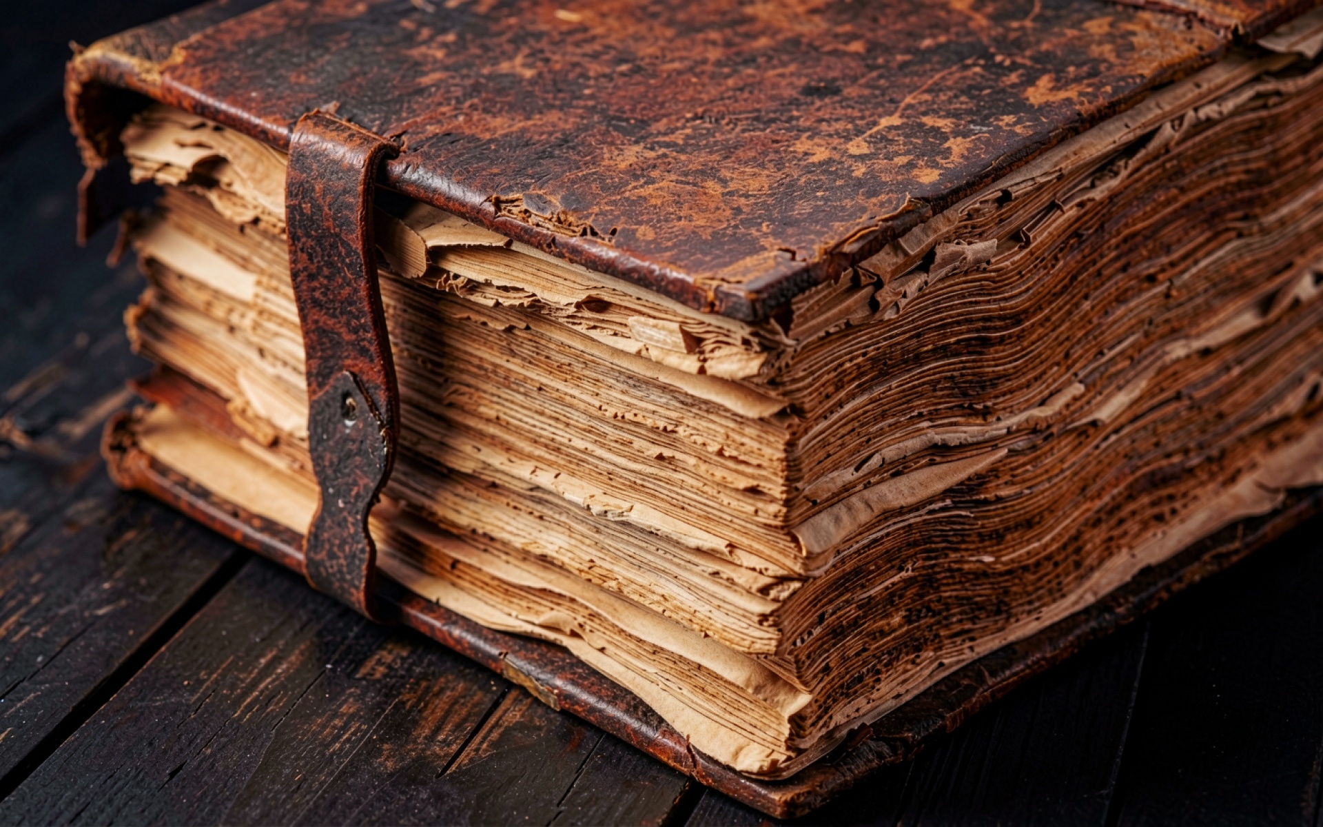 Старинная книга в кожаном переплете на дереве