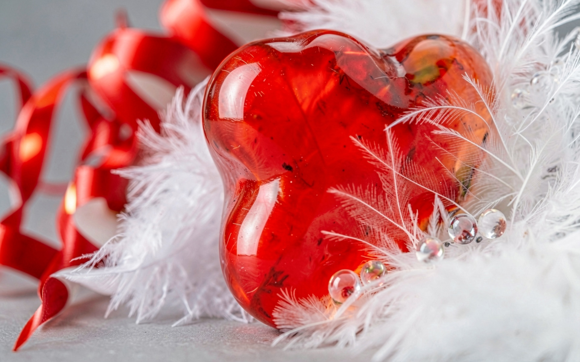 Красное стеклянное сердце в белых перьях