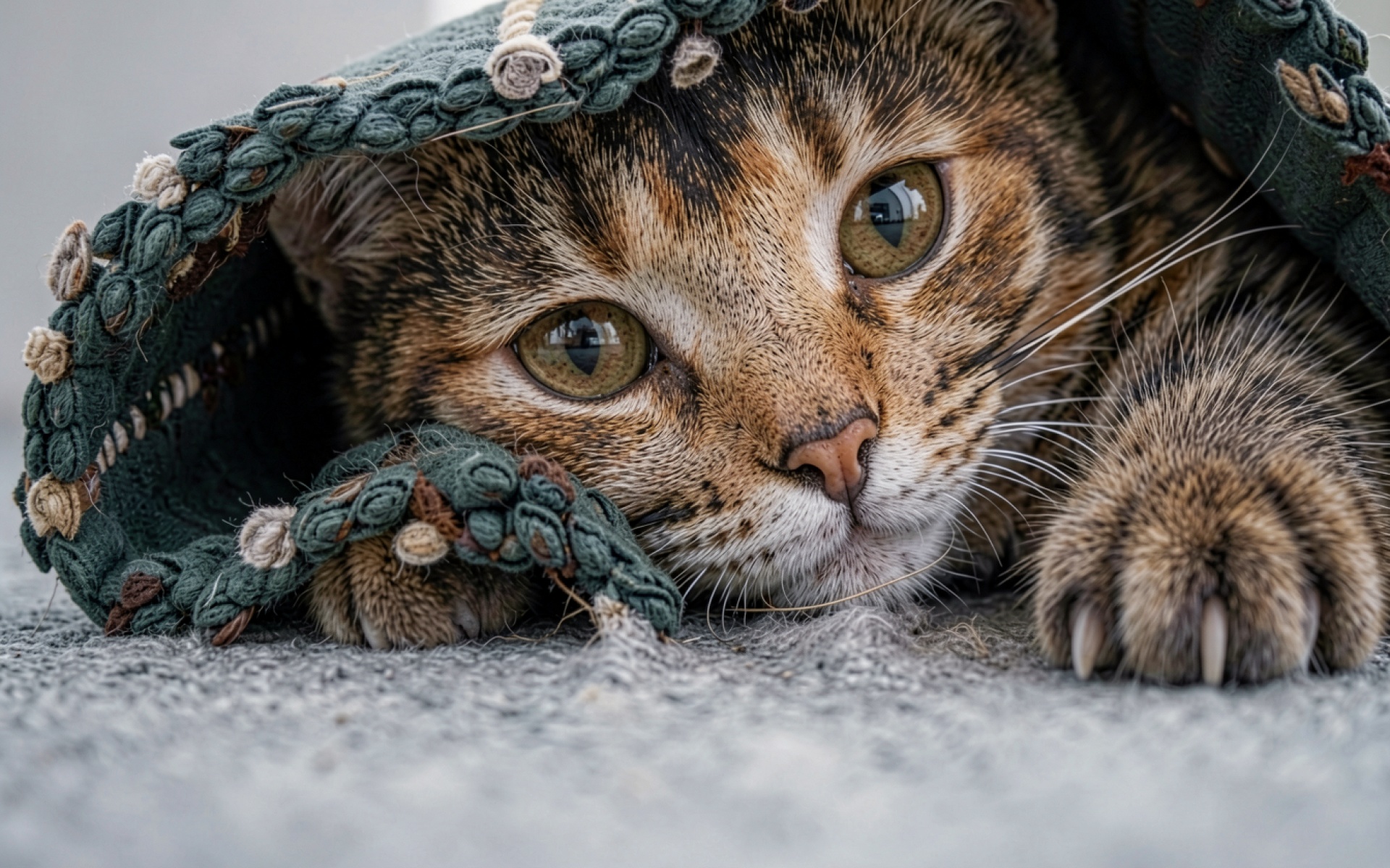 Рыжий полосатый кот под зеленым вязаным пледом