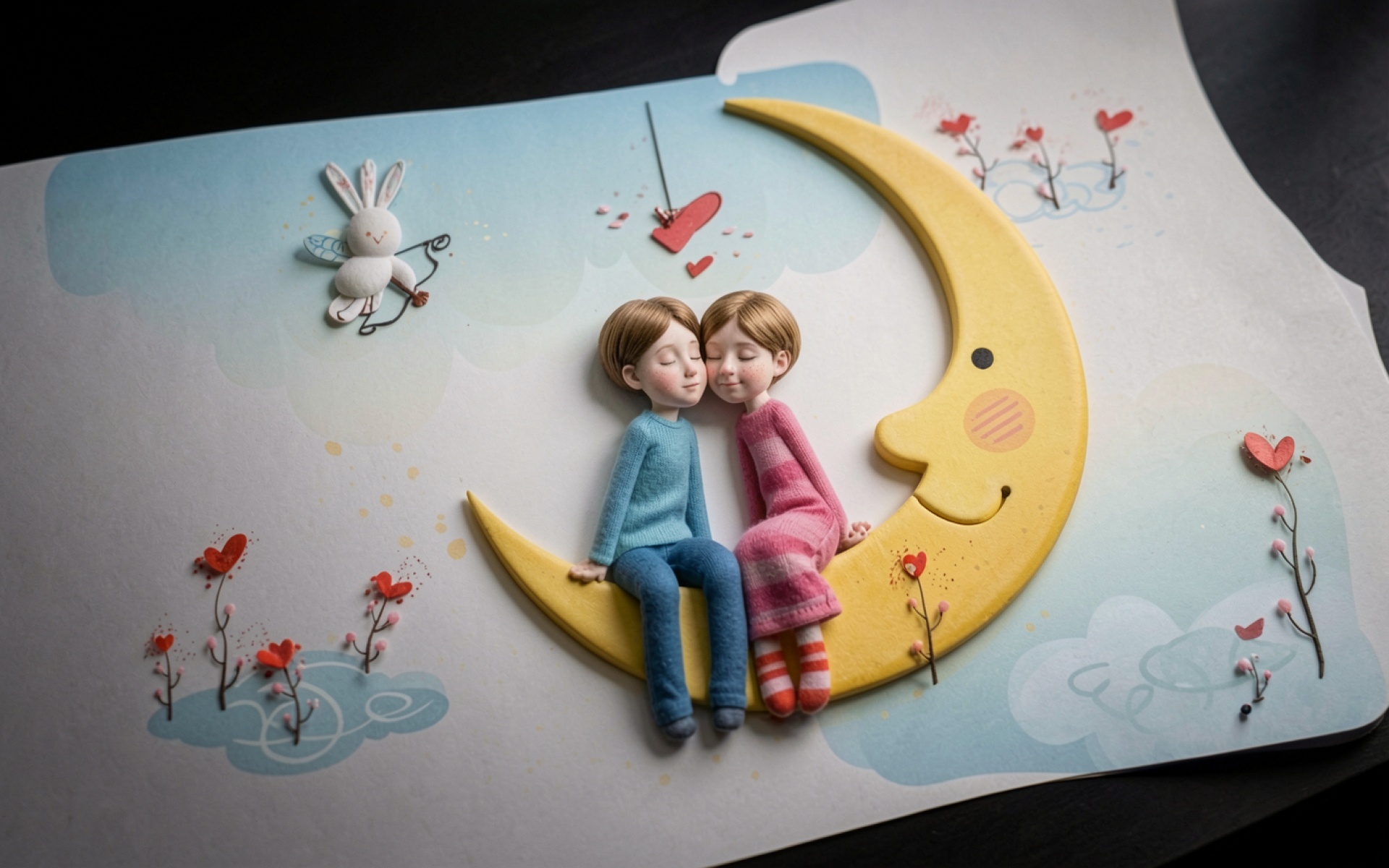 Влюбленная пара на желтом полумесяце в сказочном стиле