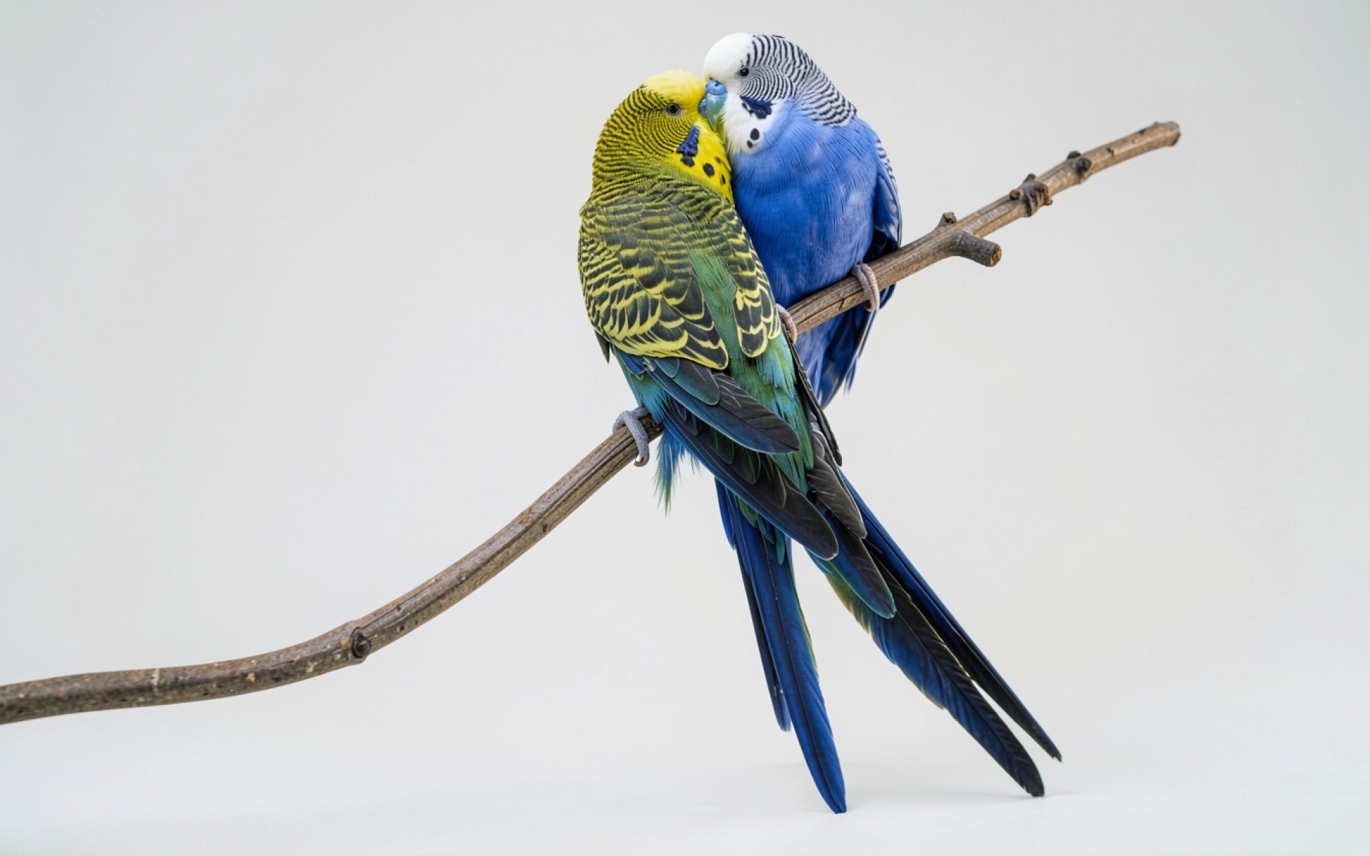 Два волнистых попугая на коричневой ветке