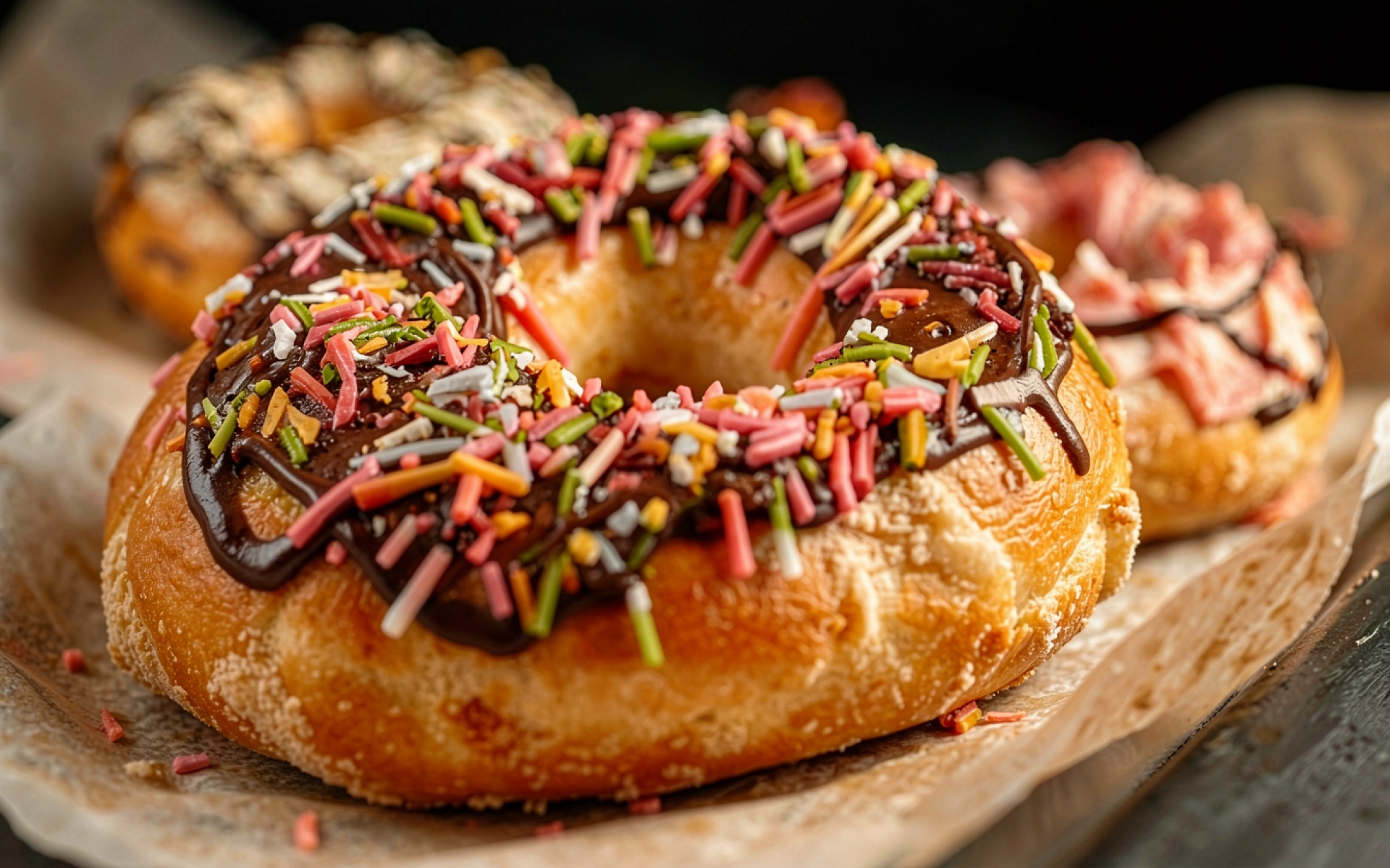 Пончик с шоколадной глазурью и цветной посыпкой