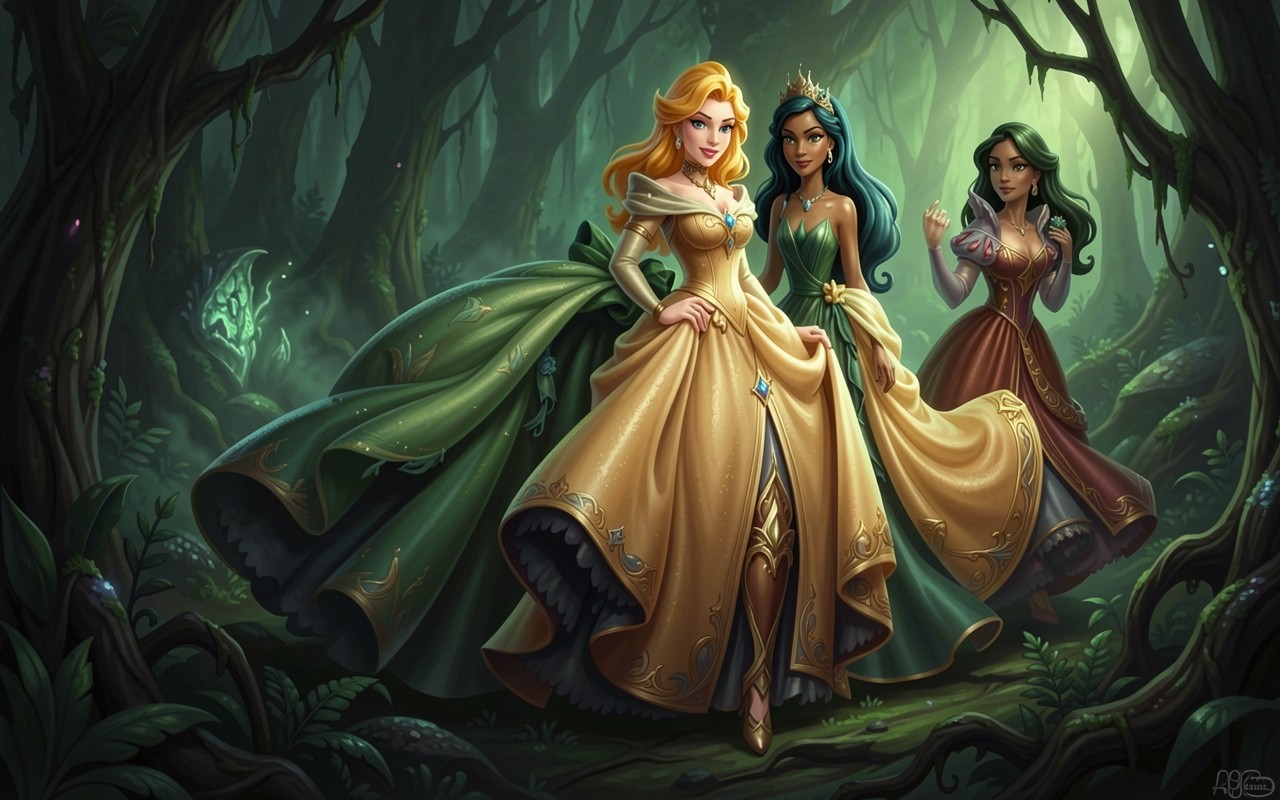 Три принцессы в пышных платьях в темном лесу