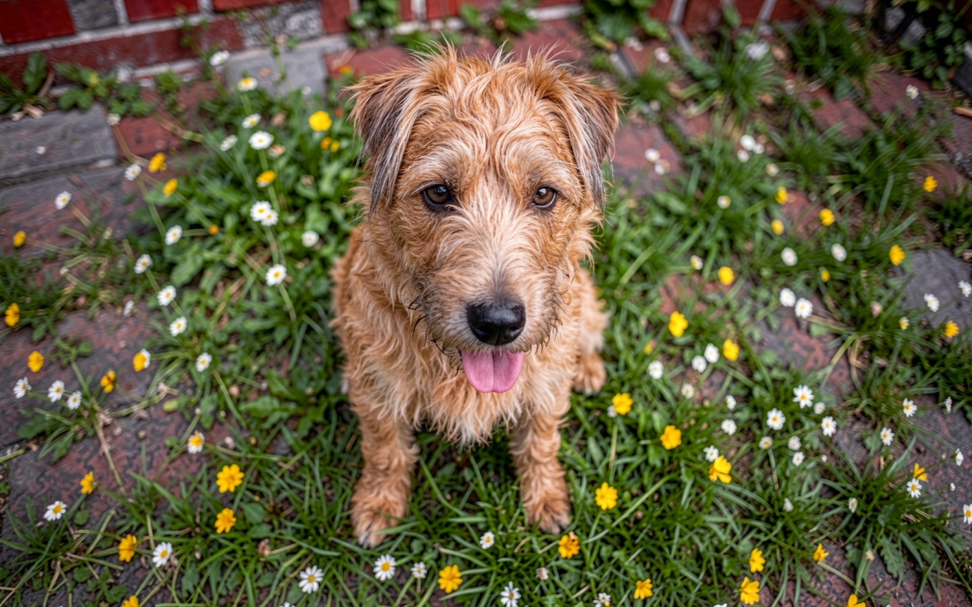 Рыжий пудель в поле белых ромашек