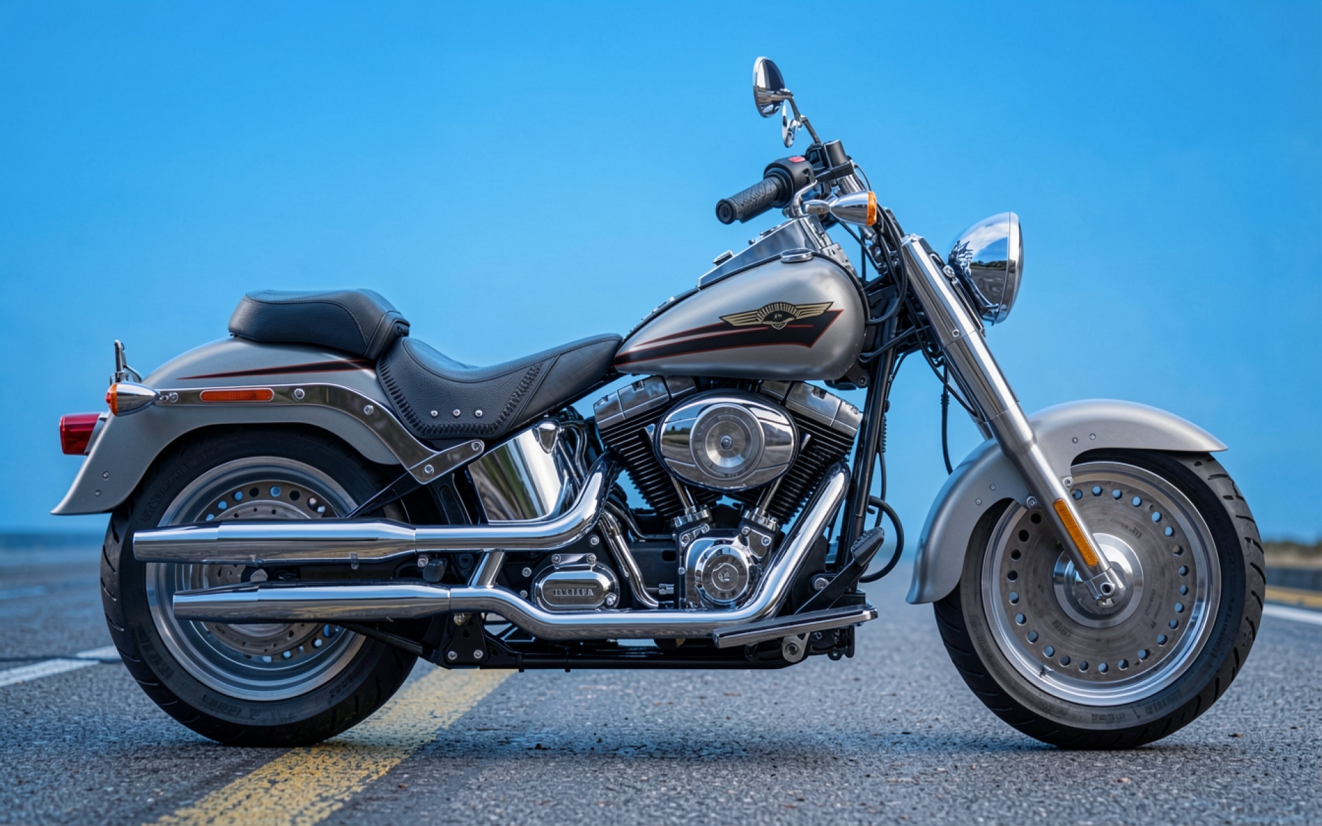 Серебристый мотоцикл круизер на пустой дороге