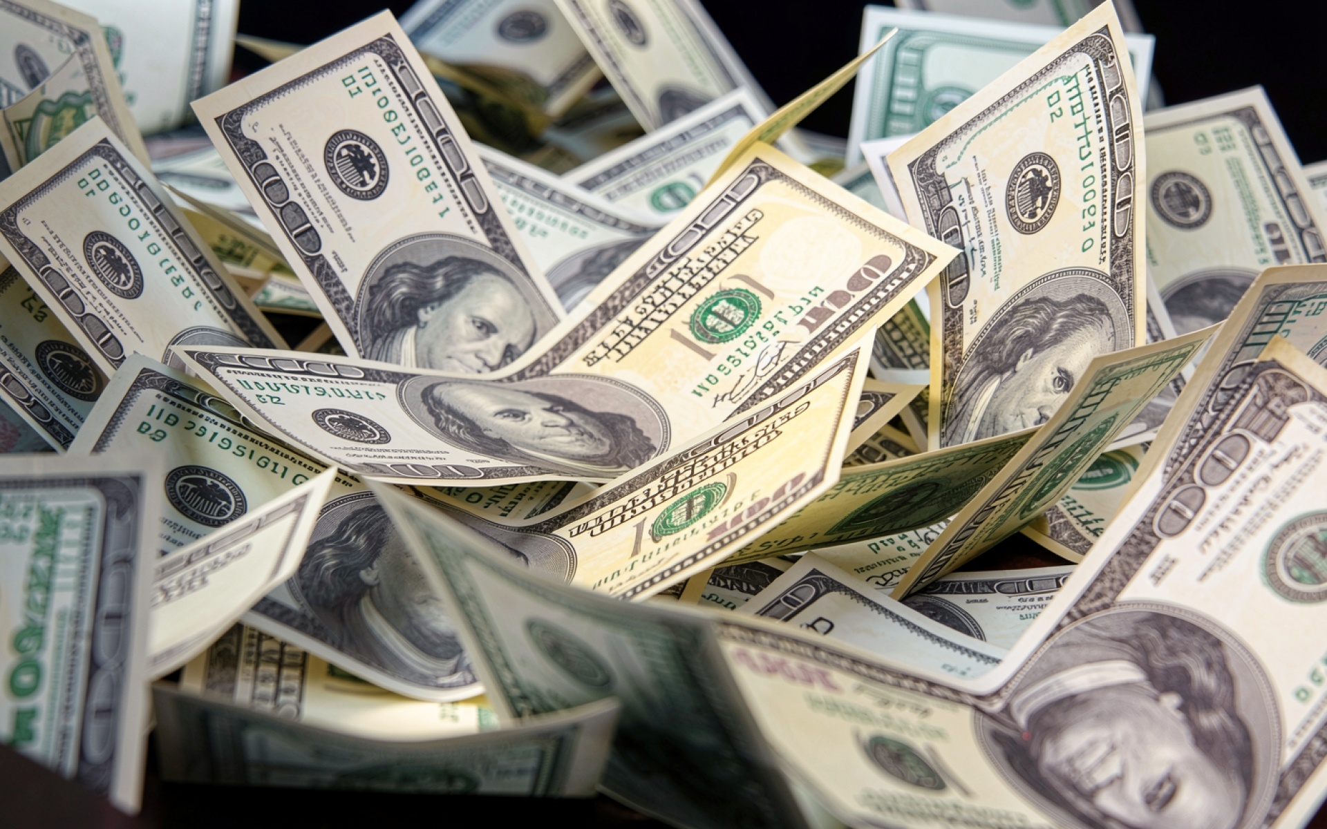 Рассыпанные купюры сто долларов в темном интерьере