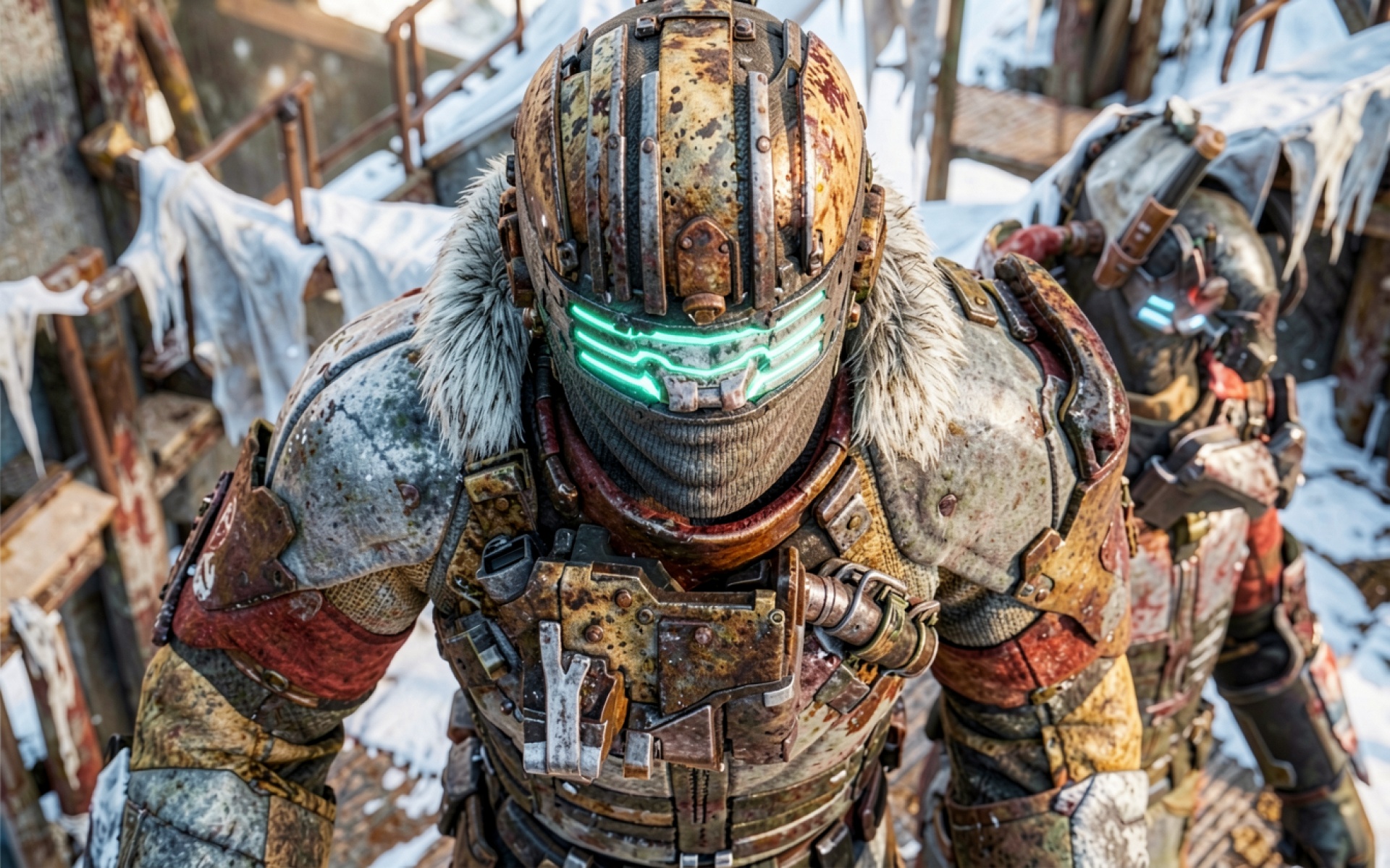 Ржавый футуристический скафандр в заснеженном индустриальном окружении