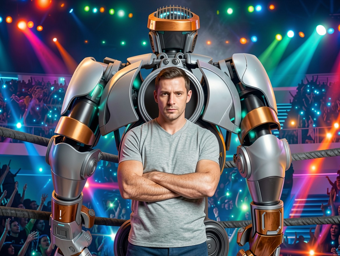 Робот и мужчина в неоновом боксерском ринге