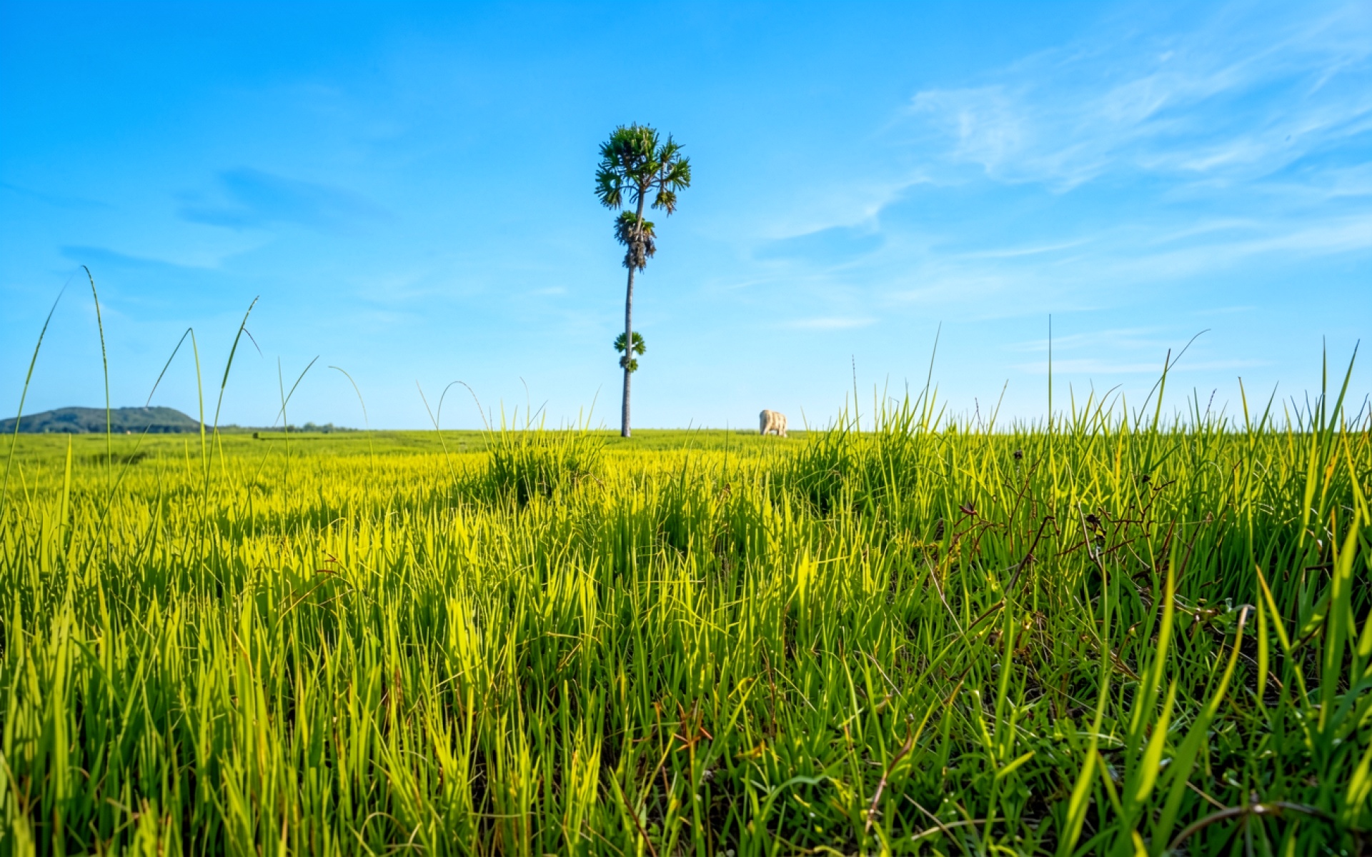 Одинокая пальма в зеленом рисовом поле
