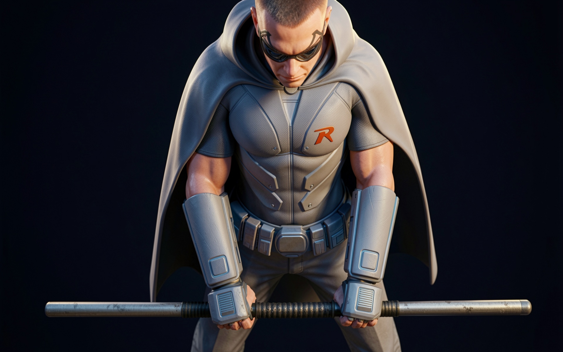 Робин в сером костюме с боевым посохом